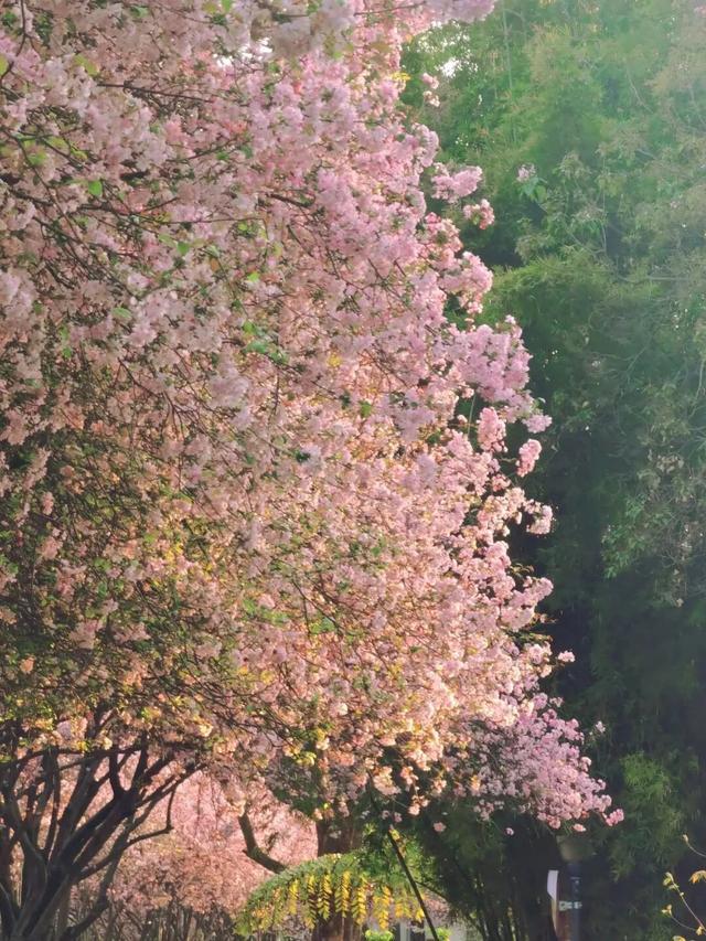 清晨的阳光温柔地洒在西华园的步道上,两侧的垂丝海棠早已缀满枝头,粉白相间的花瓣层层叠叠,几乎看不到绿叶的点缀,整片花海就像一片粉色的云团,将整条步道包裹其中。微风拂过,花瓣簌簌飘落,如同一场温柔的“花雨”,落在路上,勾勒出一幅唯美又治愈的春日画卷。