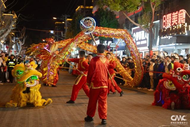 当晚6:30,伴随着铿锵有力的锣鼓声,民俗行街表演正式拉开帷幕。由150余人组成的表演队伍从北门路出发,沿八一路步行街一路向南行进,为市民呈现了一幅流动的民俗画卷。气势磅礴的舞龙舞狮队伍引得现场阵阵喝彩,憨态可掬的“福禄寿喜财”五神穿梭在人群中,将美好的祝福送给沿街商户和过往市民。而极具崇明本地特色的“掼田财”“牡丹亭”和“非遗跑马”表演,勾起了许多崇明人的温暖记忆。