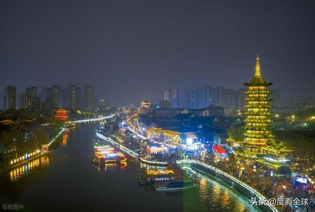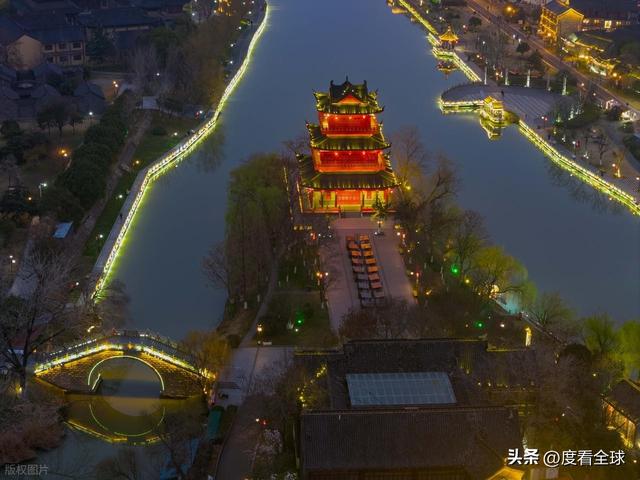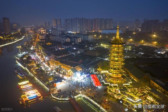 国师塔下,是灯光秀的核心观赏区。当灯光投射在塔身上,塔身的纹路被清晰照亮,光影不断变换,时而展现淮安的历史变迁,时而呈现现代城市的繁华景象,古老的塔身与现代灯光交相辉映,诉说着千年古城的过去与现在。不远处的清江浦景区,灯光与古建筑完美融合,飞檐翘角在灯光的映衬下愈发古朴典雅,水面上的画舫披着灯光缓缓前行,桨声阵阵,灯光点点,再现了“桨声灯影里的运河”这一经典意境。