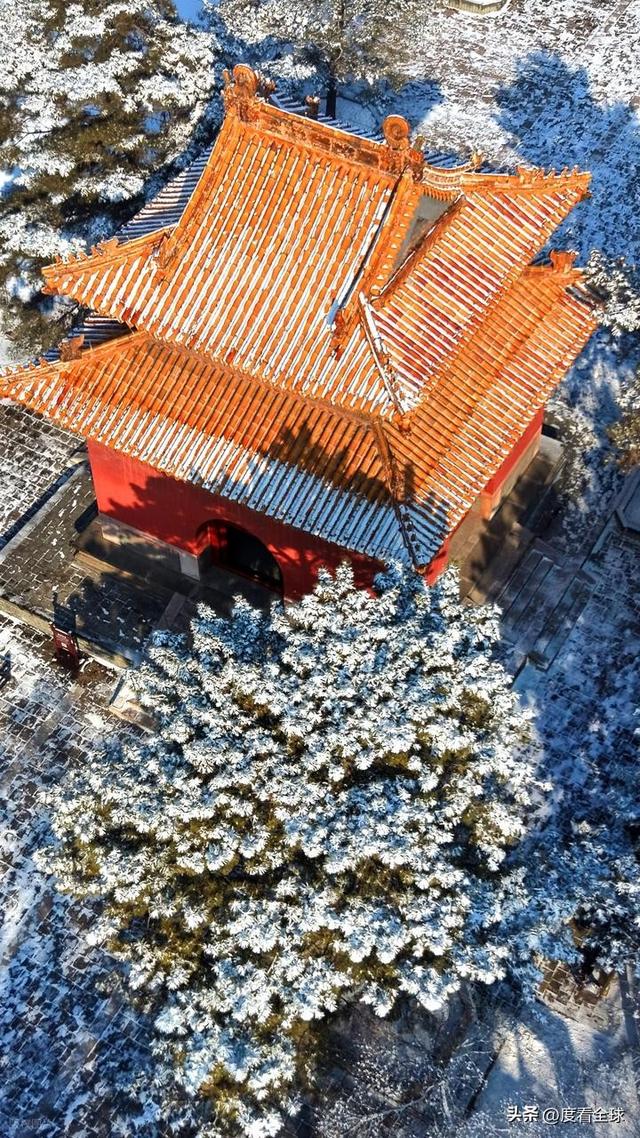 不同于吉林雾凇的壮阔绵长,清福陵的雾凇,多了一份皇家陵寝的厚重与雅致。这里的雾凇,不似别处那般张扬,而是顺着陵寝的建筑脉络悄然生长,缠绕在古松的枝干上,覆盖在红墙的棱角处,点缀在飞檐的翘角间,与正红门的朱红、隆恩殿的黄瓦、方城的青砖,形成了强烈而和谐的色彩碰撞,既有冰雪的清冽,又有古建筑的雄浑,更有东方美学的留白意境。