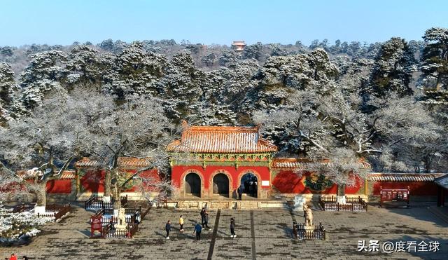 当第一缕阳光穿透云层,洒在天柱山的山巅,清福陵的轮廓渐渐清晰。往日里庄严肃穆的皇家陵寝,被一层厚厚的雾凇温柔包裹,玉树琼枝,白雪覆檐,红墙与白雪相映,飞檐与雾凇共生,风一吹,冰晶簌簌飘落,似雪非雪,似雾非雾,整个园区仿佛闯入了一场千年不醒的冬日梦境。