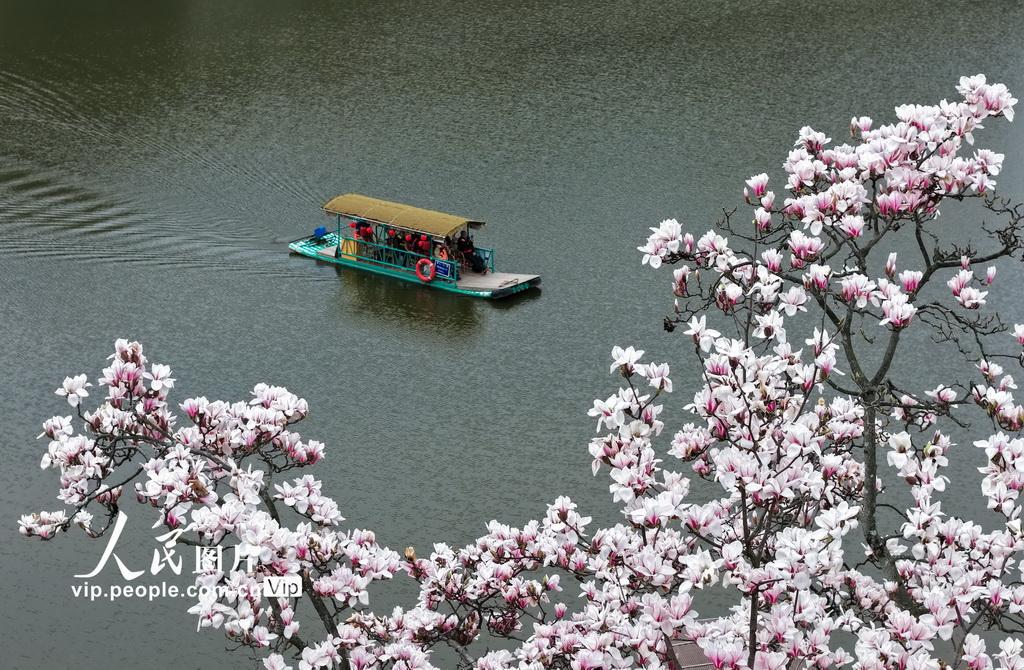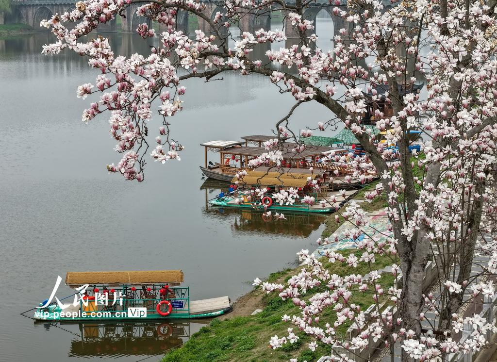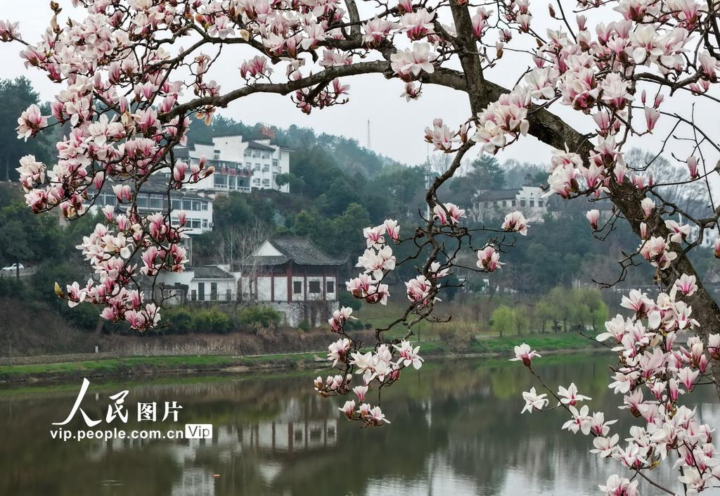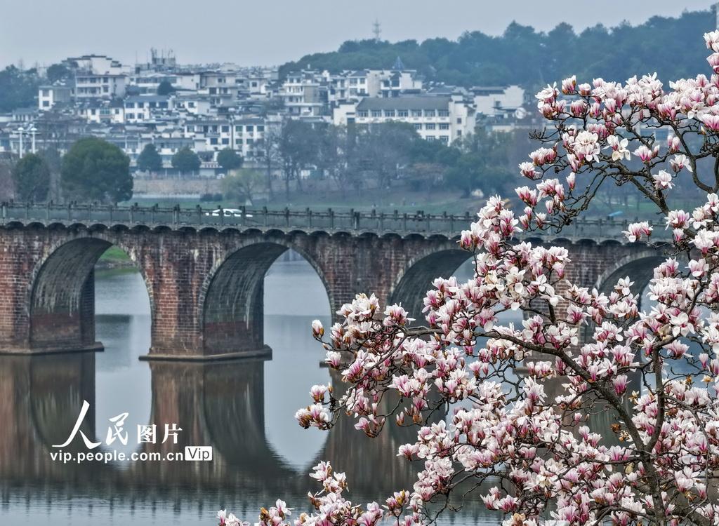 2026年3月4日,安徽省黄山市歙县新安江畔多景园里的玉兰花渐次绽放,与古桥古塔、江水相互映衬,构成一幅春意盎然的江南画卷。施亚磊摄(人民图片网)