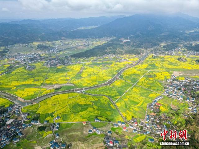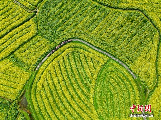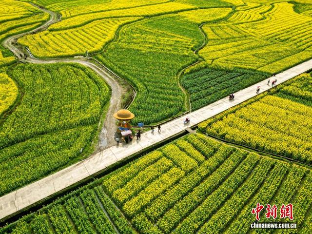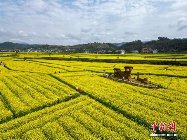 3月4日,湖南怀化市会同县堡子镇万亩油菜花田竞相绽放,漫山遍野铺成金色海洋,一步一景皆是田园诗意。不远处的稻梦小镇,5万株郁金香绚丽绽放,与金色花海相映成趣。