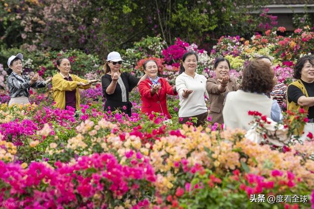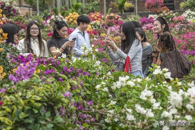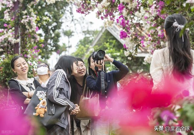 大批女游客循着花香而来,她们身着浅色长裙,穿梭在花丛间,或驻足凝视,或浅笑合影,手机快门声此起彼伏。有人蹲在花下,与一朵盛放的三角梅近距离同框;有人牵着闺蜜的手,漫步在花廊下,让春风拂过发丝,让花香沾满衣角;还有人坐在溪边的石凳上,望着眼前的花海,享受着难得的静谧与惬意。
