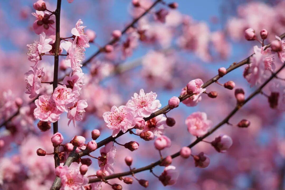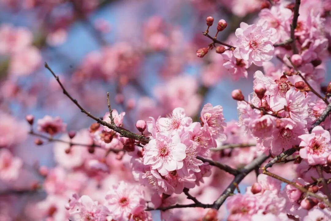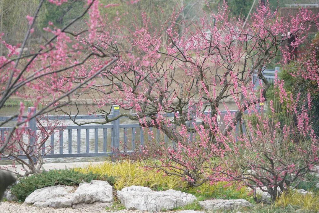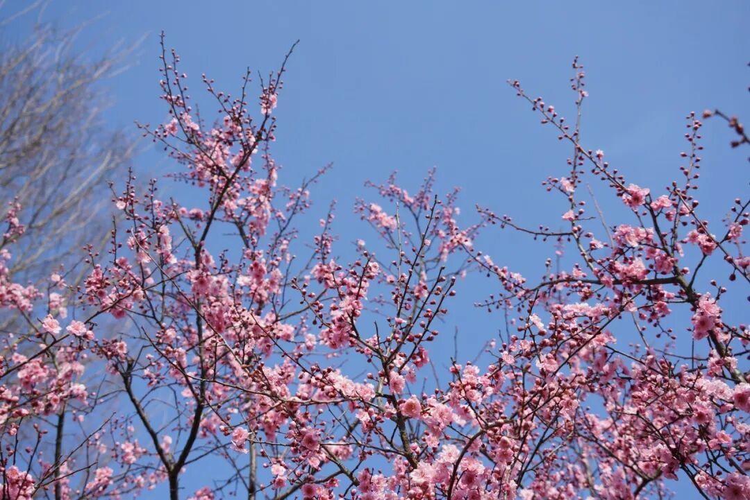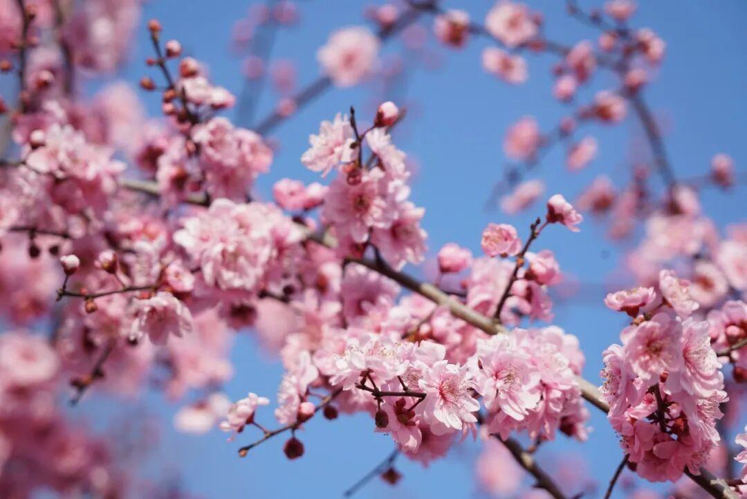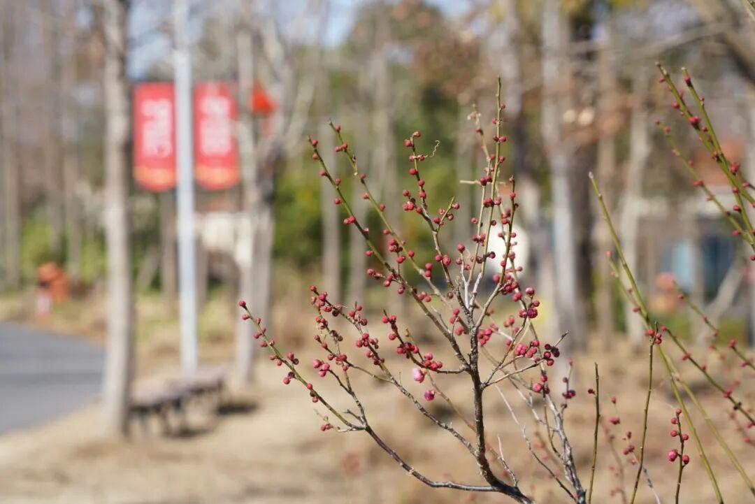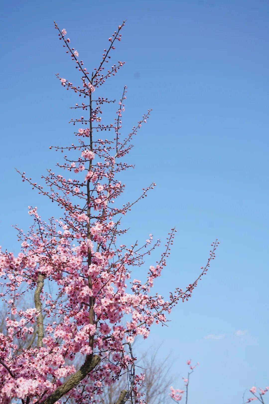 红梅热烈如火,远望如一片绯红的云霞落在水中央;走近看,枝头点点红蕊,衬着初春湛蓝的天空,随手一拍,便是春意盎然的画面。