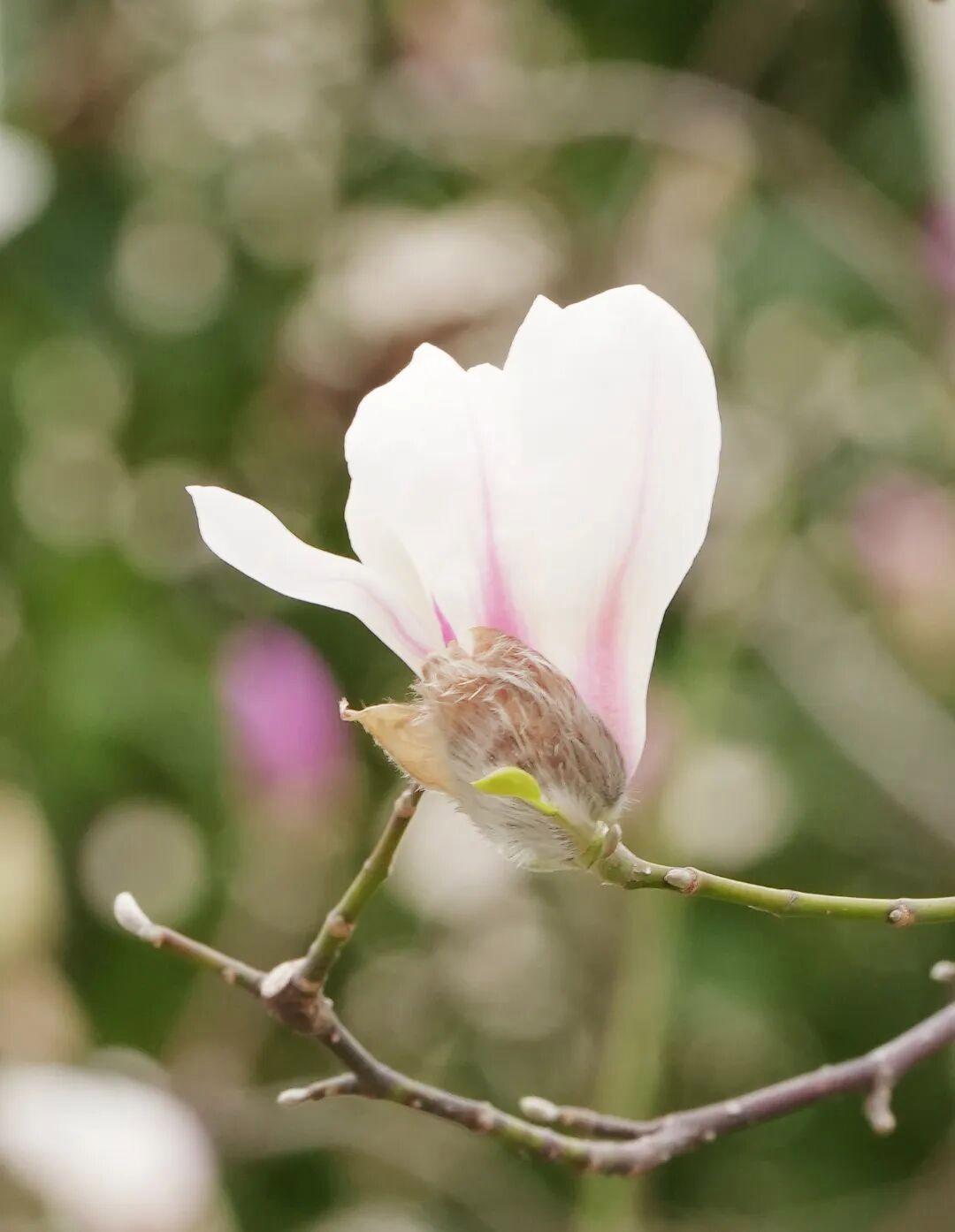 除了清新素雅的白玉兰,玉兰园内的二乔玉兰也别有一番韵味。它的花瓣底晕着一抹嫣红,花开时姿态微垂,带着几分欲语还休的娇柔,惹人生怜。当阳光透过,那抹粉晕越发温润,为春日增添了几分柔情。