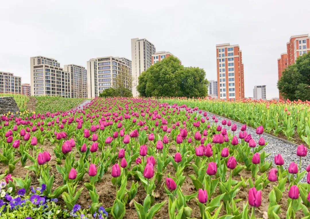 不必远走,在普陀区就能观赏郁金香,top中央公园新增的郁金香花海已拉开序幕,18种郁金香品种,面积近万平方米。