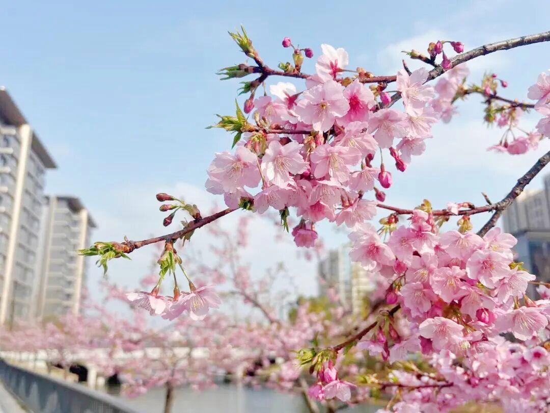 在春雨的滋润下,早樱如约而至。在一众早樱中,河津樱相对开花时间较早,花姿舒展、花量繁密,是春日里独特亮眼的景致。眼下,常和绿地里的河津樱迎来了盛花期,柔粉缀满枝头,层层叠叠,宛如粉色云霞。