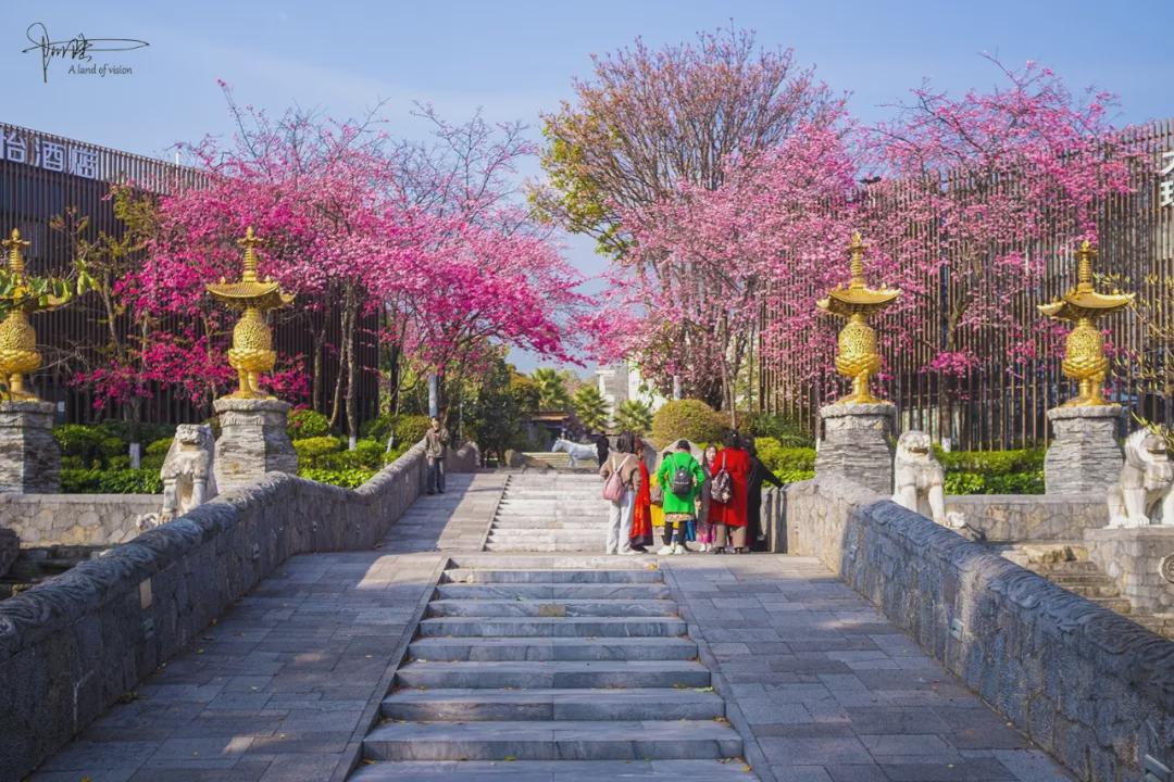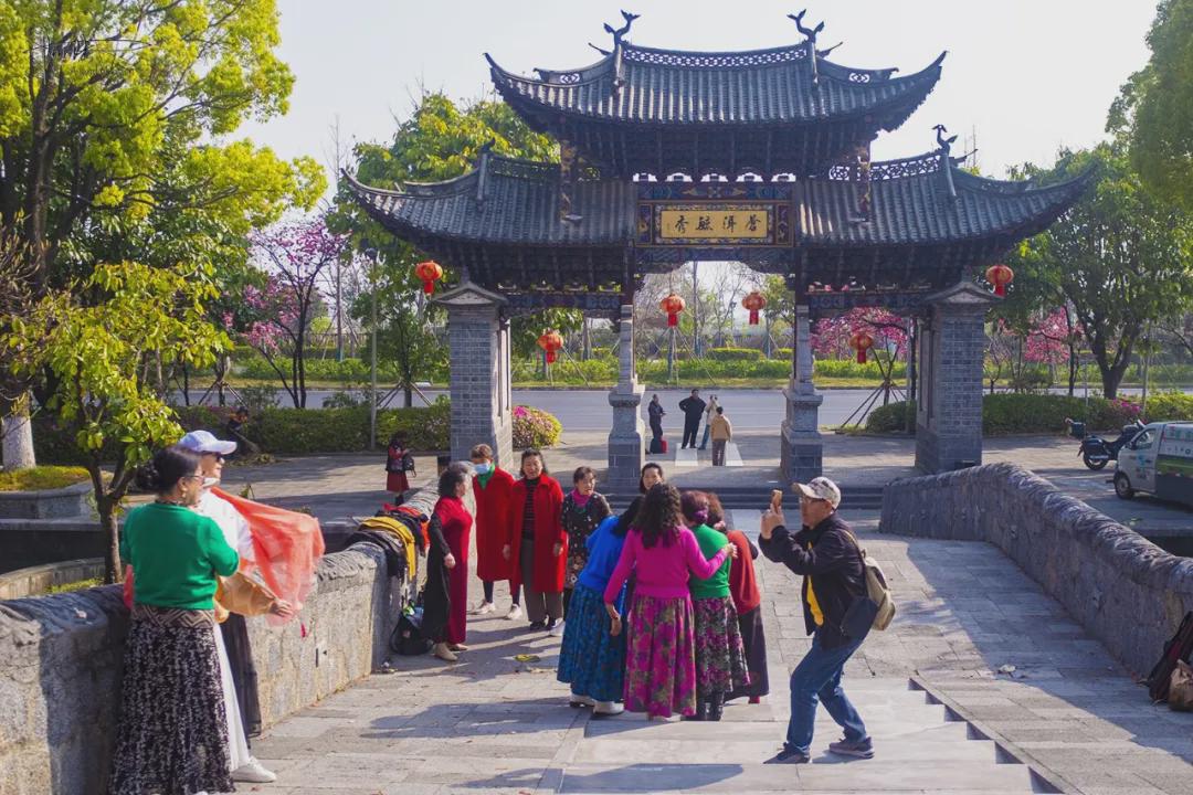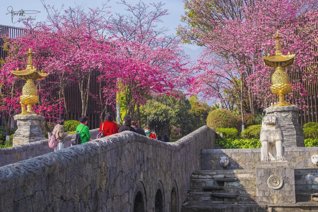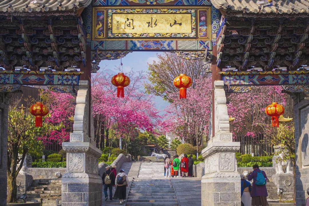 对照地图,这座山水间牌坊和这些樱花树的位置原来是“大理山水间-东北门”,目测刚好有工作人员在清理樱花树前的水池,想必过两天再来,此地的风景又会比现在更胜一筹。如果你也对这里感兴趣,除自驾前往外,也可以乘坐4路、古城C7路公交车,到“弘圣路口”站下车后再徒步142米即达。