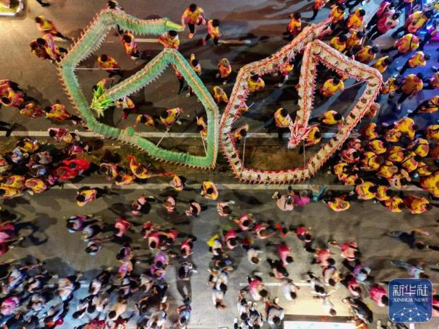 表演者在古庙游神活动中表演舞龙(无人机照片)。