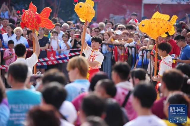 表演者在古庙游神活动中表演鲤鱼舞。