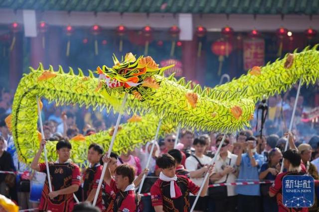 表演者在古庙游神活动中表演舞龙。