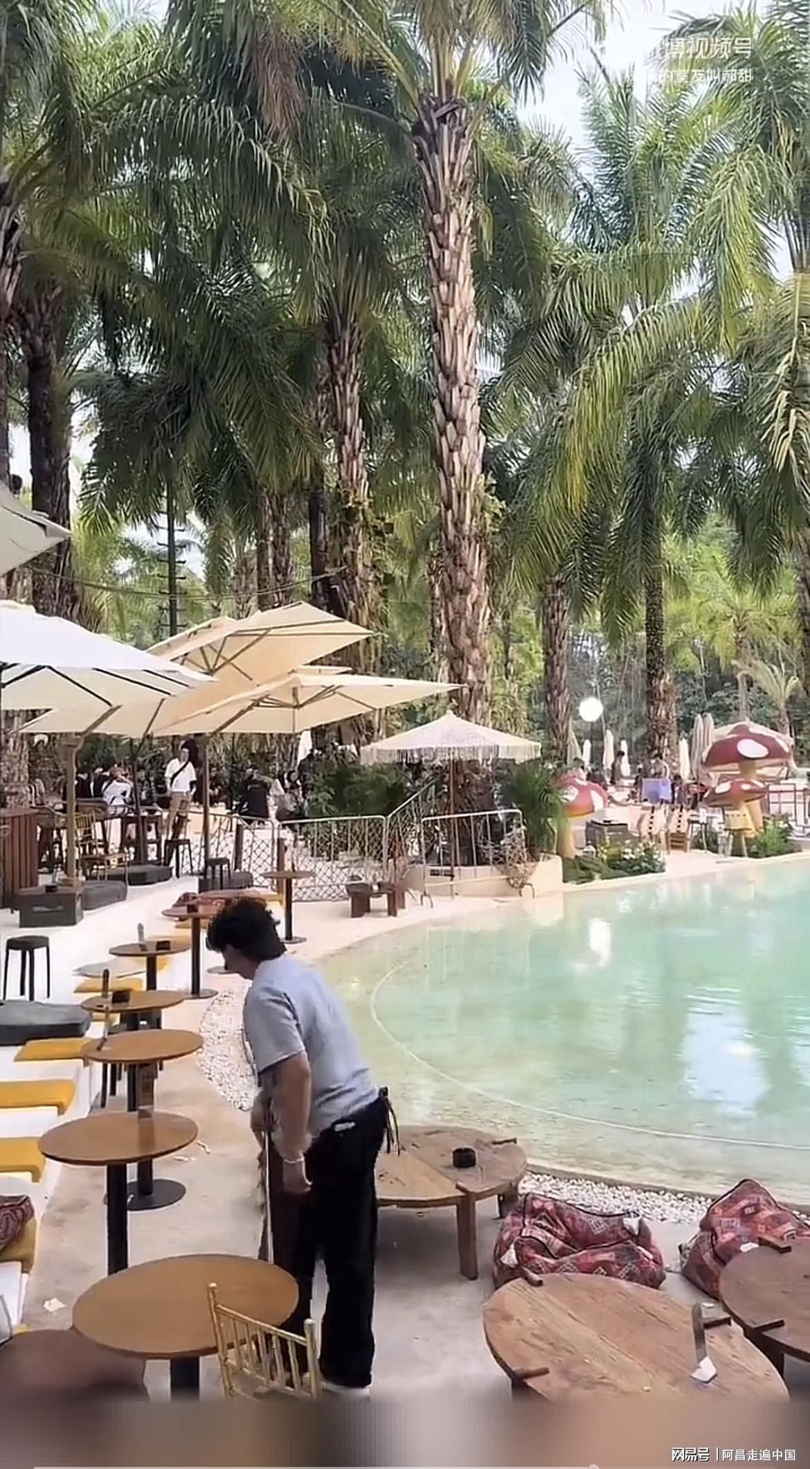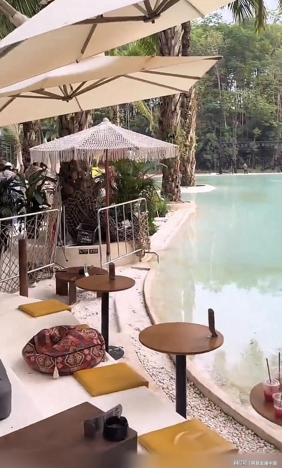 从网友发布视频来看,此景是一个碧绿水池,四周有高大的个棕榈树,一些带版纳热带风情装饰,周围都有游客围坐聊天,是一个休闲娱乐地方。
