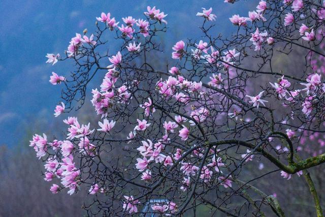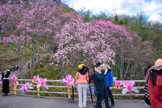 在桂溪镇九皇山、药王谷景区,漫山辛夷正褪去寒意、蓄力绽放,粉的、白的、红的、紫的花,缀满枝头,如烟似霞,美不胜收。山间清风裹挟着花苞的清甜,有人举镜定格初绽芳华,有人随羌家姑娘共跳沙朗,欢声笑语间,羌山春日的氛围感满满。