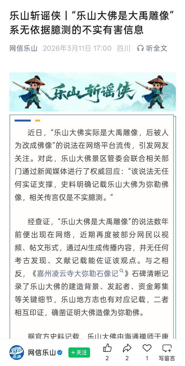 “乐山大佛是大禹雕像”的说法属于对世界文化遗产历史定论的否定,是不实有害信息和网络炒作。网络空间不是法外之地,造谣传谣不仅会误导公众认知,还会破坏网络传播秩序。在此提醒广大网民,面对网络信息要保持理性判断,主动甄别真伪,通过官方渠道了解权威信息,做到不信谣、不传谣、不造谣,共同守护清朗的网络环境。