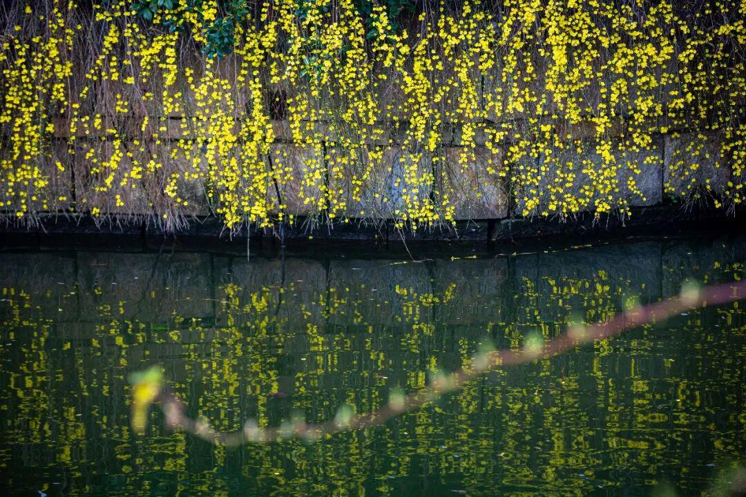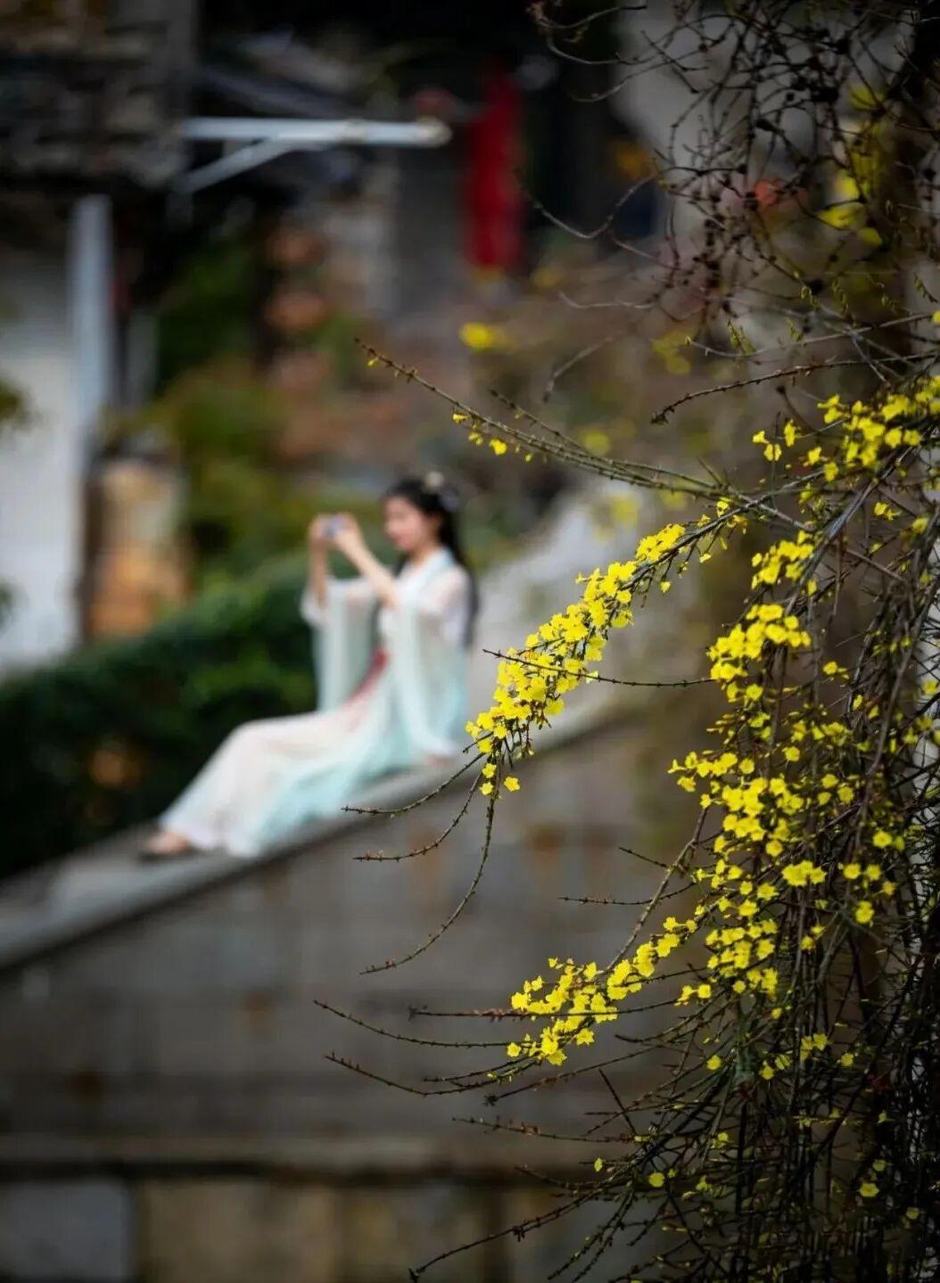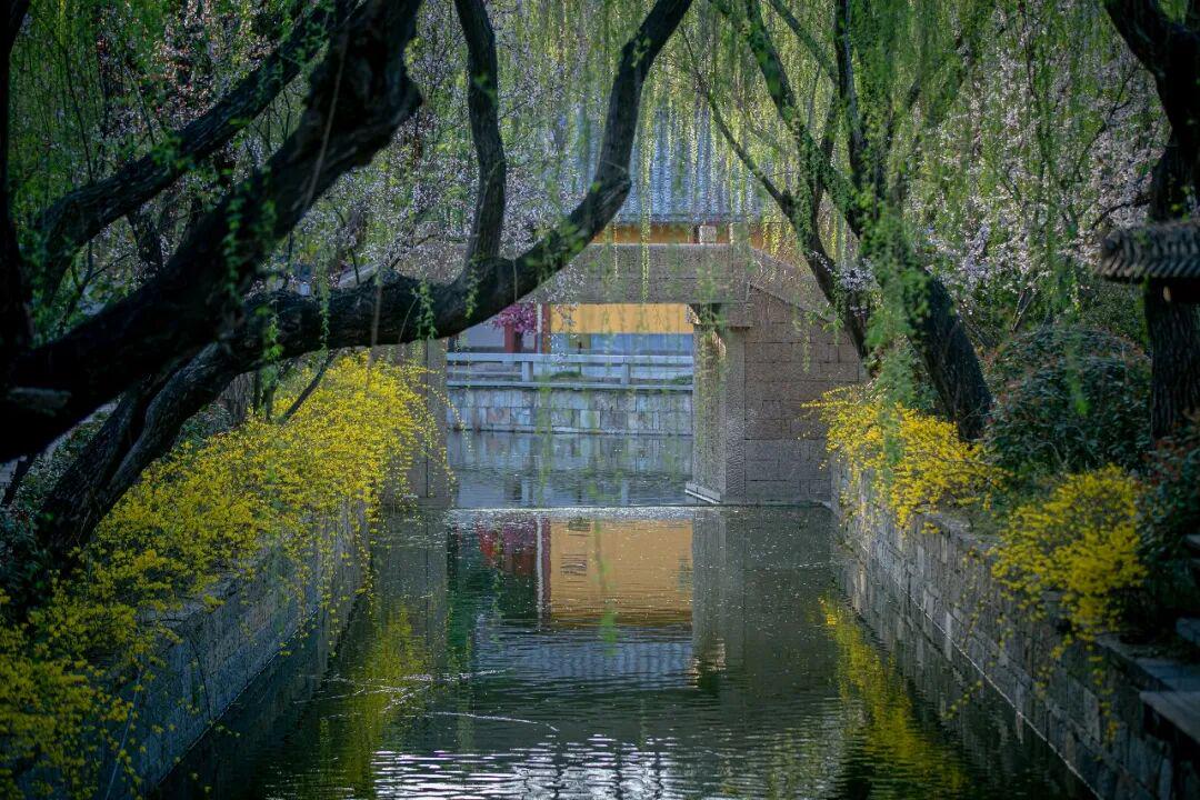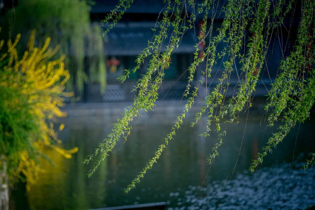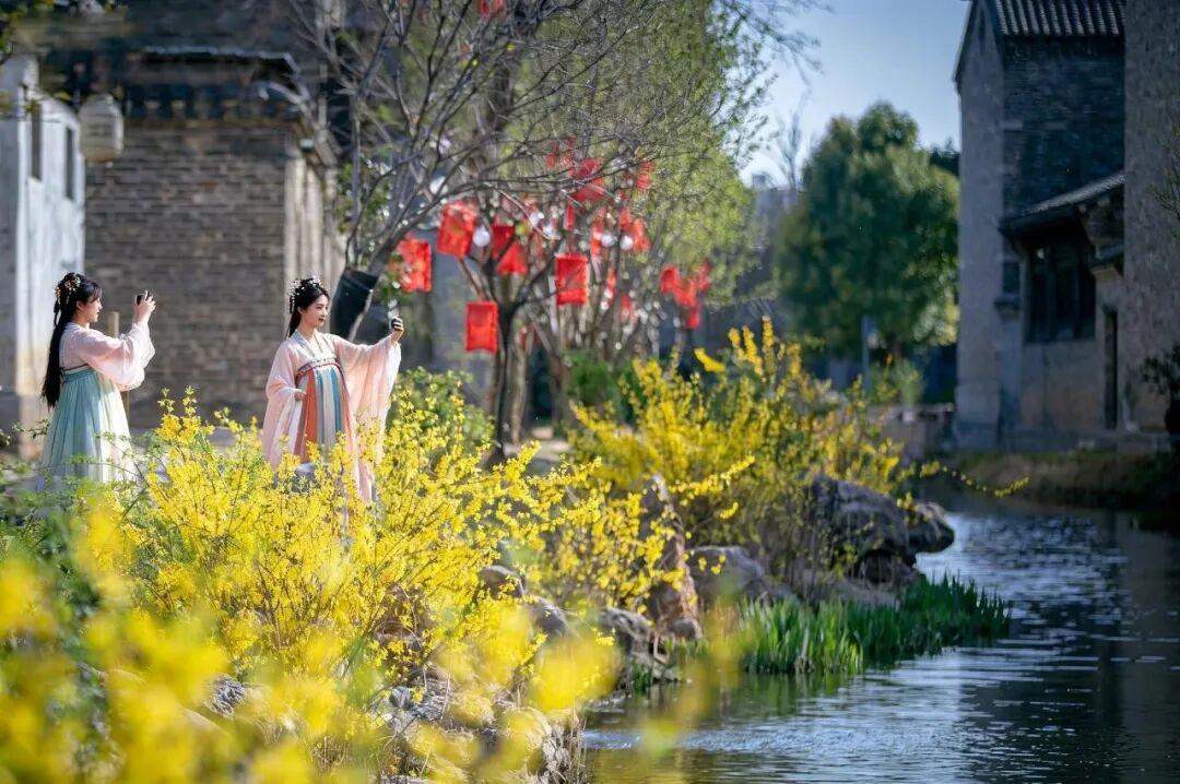 连翘和迎春花在景区内沿河及桥边热烈盛开。金黄的花朵簇拥成团,顺着河岸蔓延开来,犹如一条璀璨的金色丝带。春风轻拂,花枝摇曳生姿,为古城增添了一抹明快活泼的色彩。