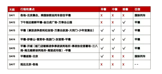 笔者打开其中一个北京-朝鲜7日游产品,无非是平壤、妙香山、开城等知名景点,再加几个小众城市。