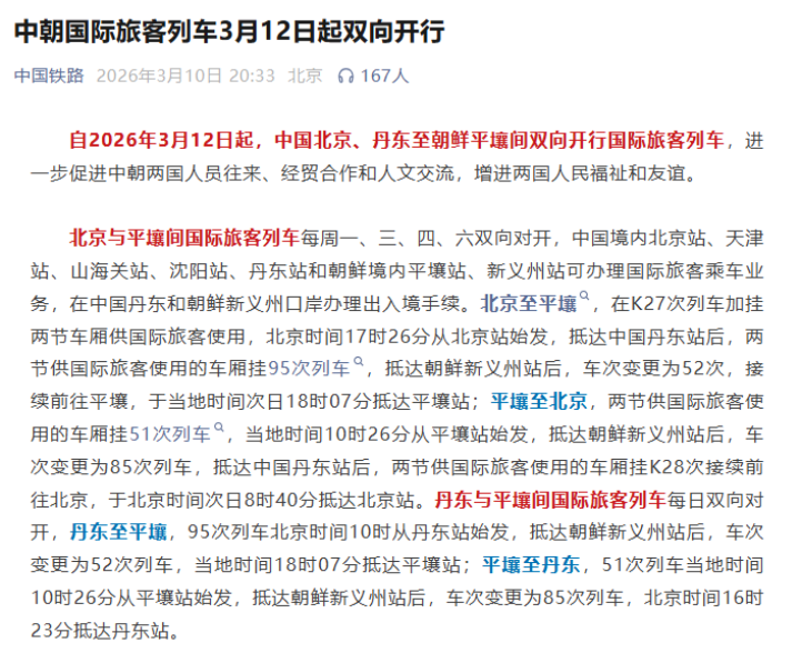 事情的起因是,据中国铁路官方公众号发布:自2026年3月12日起,中国北京、丹东至朝鲜平壤间双向开行国际旅客列车。