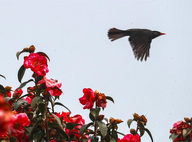 春光不仅染红了花,也唤来了山间的精灵。几十种鸟类循香而至,在花枝间跳跃穿梭,灵巧采蜜。翅膀扇动时抖落金粉,清脆的鸣叫声此起彼伏,与赏花人的笑语交织成春日林间最动听的和鸣。
