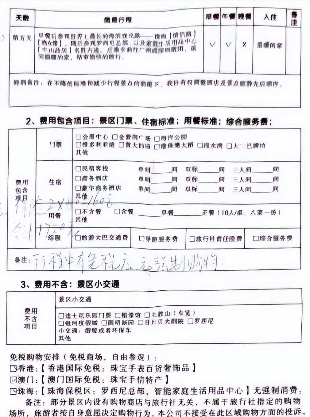 3月8日,两名记者抵达深圳,旅行社派专车接至酒店,在酒店大堂与旅行团“合同专员”签署了《港澳旅游合同》,并支付了尾款1720元(含剩余团费,此外还有额外要求2人支付的400元导游小费和160元保险费)。