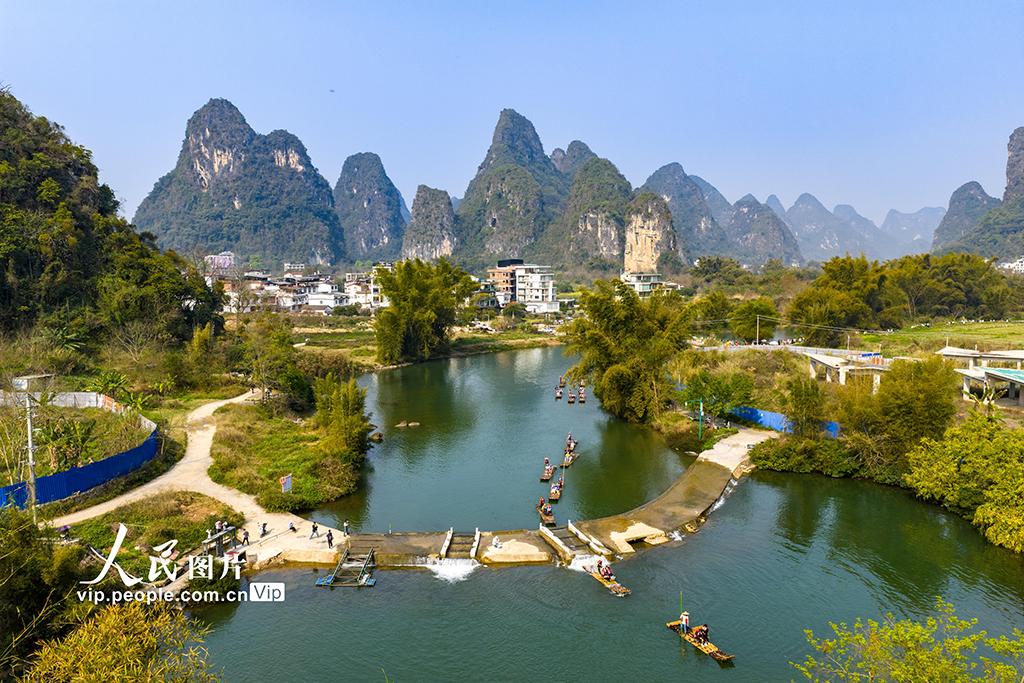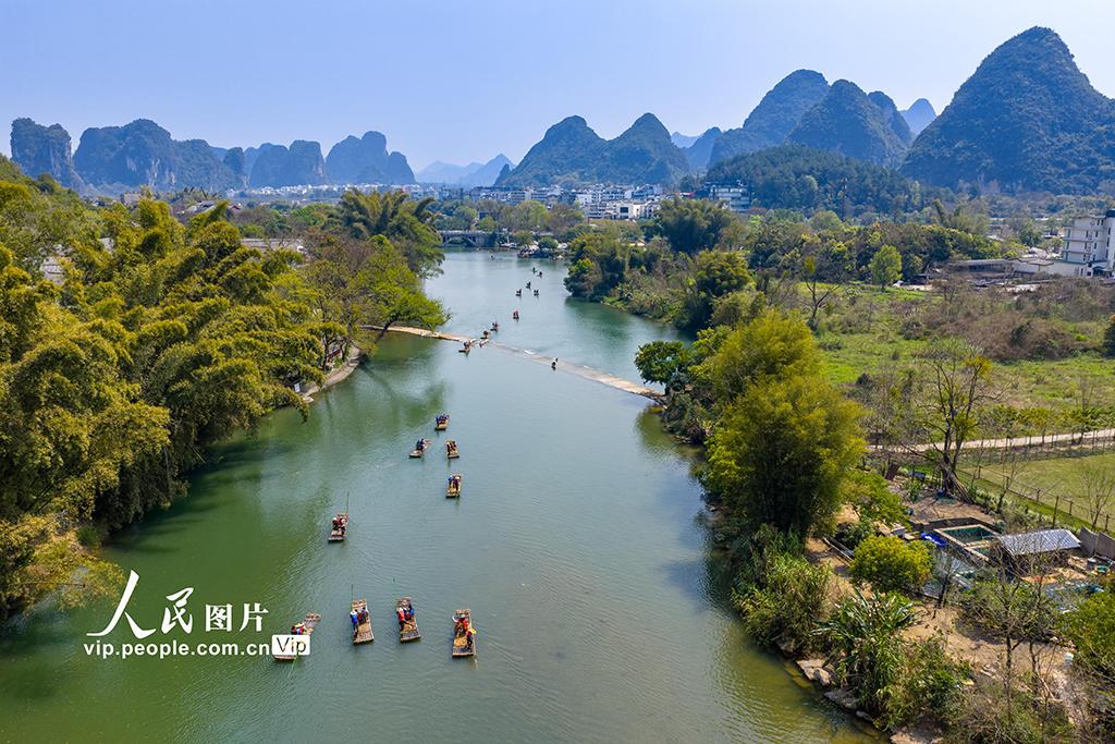 2026年3月14日,在广西桂林阳朔县,众多游客乘坐竹筏游览遇龙河,欣赏沿岸的山水风光。黄胜林摄(人民图片网)