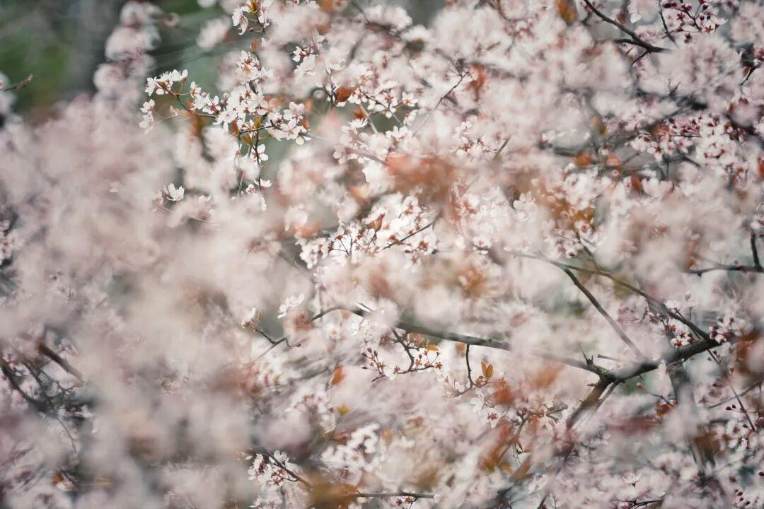 粉白的花簇缀满枝桠