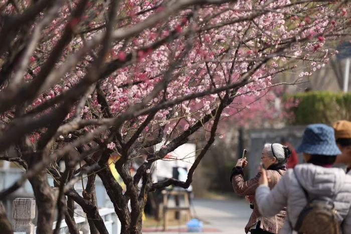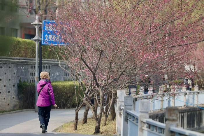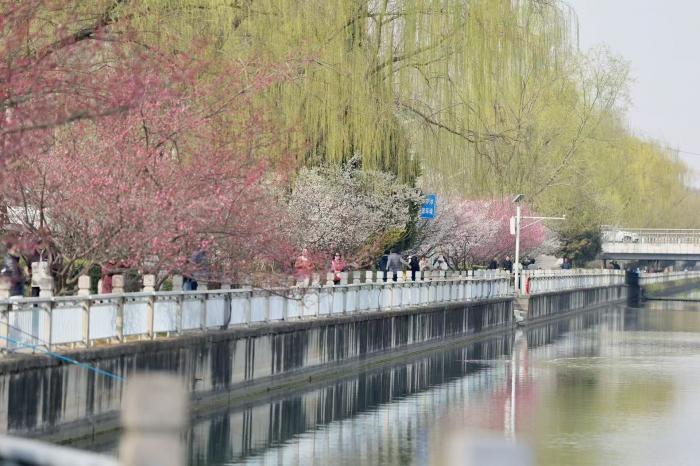 不少市民沿着河岸步道漫步赏梅,用镜头定格古建与繁花的同框瞬间。