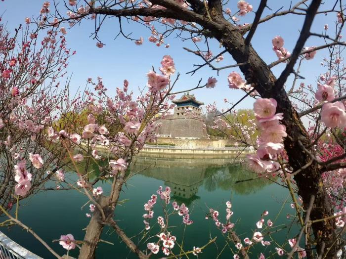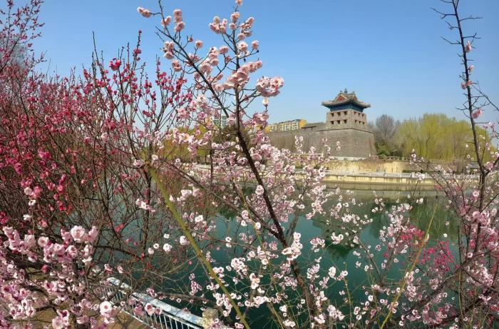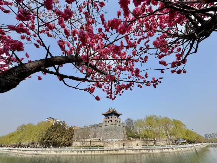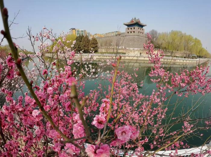 三月京城春意渐浓,东南二环护城河畔,左安门角楼旁的梅花已进入最佳观赏期。粉白嫣红的花枝临水斜出,与青砖灰瓦的角楼相映成趣,在车水马龙的都市中勾勒出一幅古韵盎然的春日画卷。