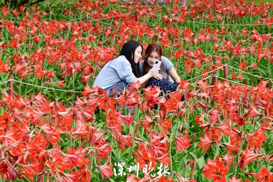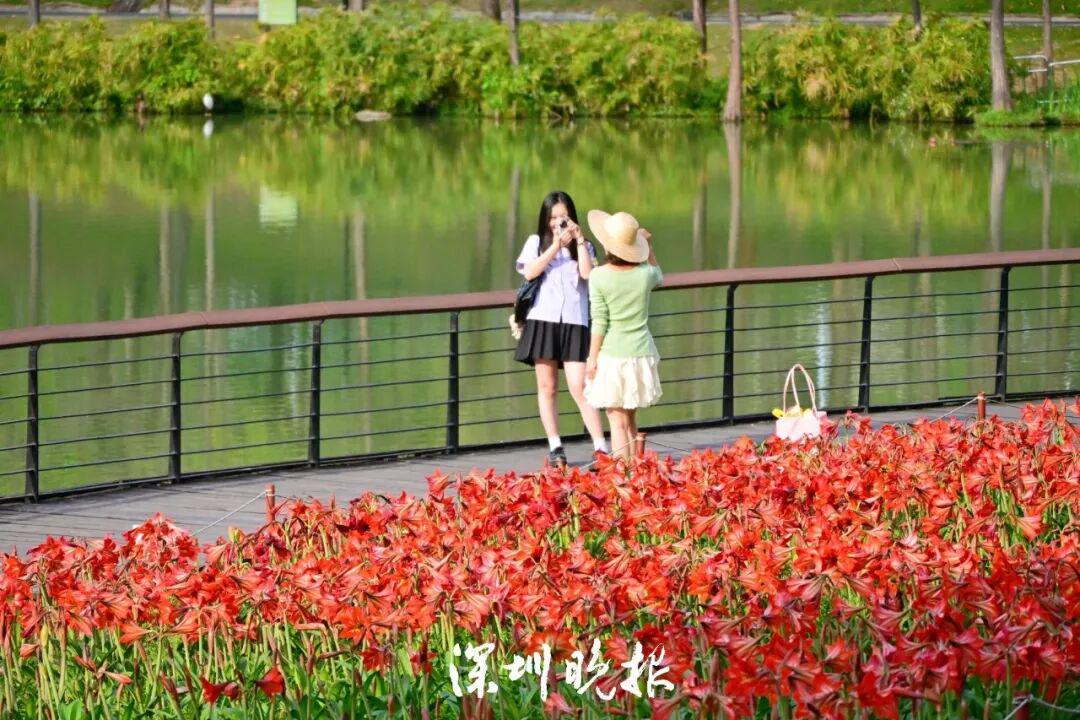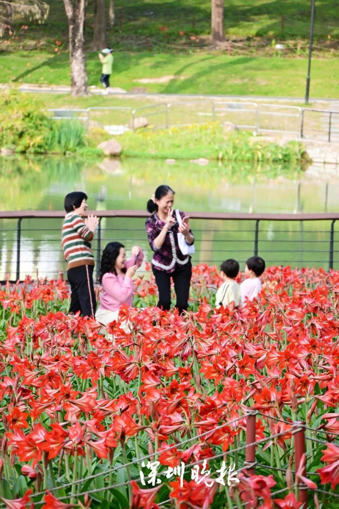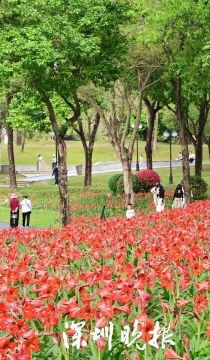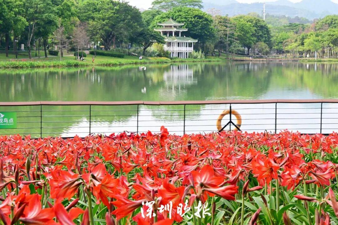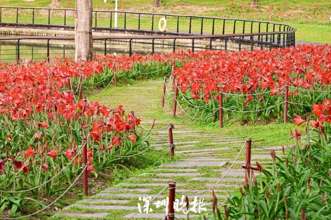 沿着景观湖畔漫步,一片绚烂的红色花海瞬间映入眼帘,这正是公园精心培育多年的春日主角 —— 朱顶红。