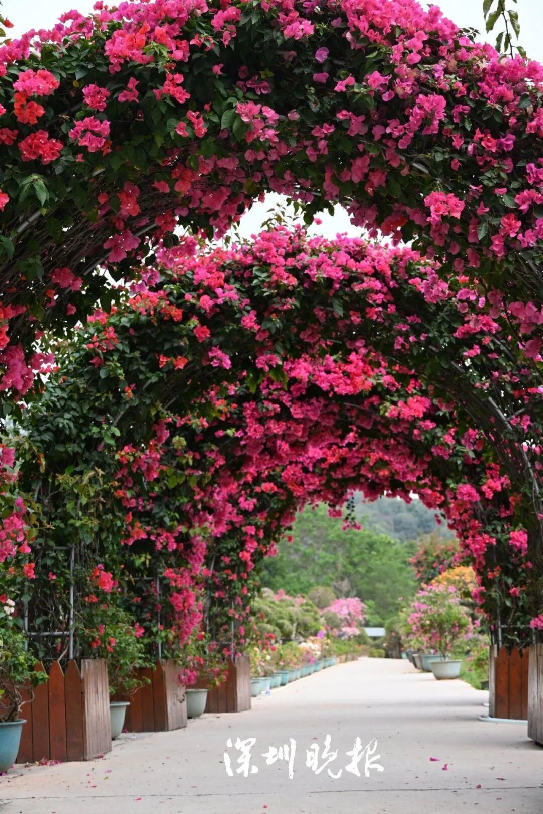 从造型各异的蜿蜒花廊,到被繁花温柔包裹的小径,再到缠绕在路边枝干上、如瀑垂落的花束——你总能在某个不经意的转角,与一簇簇、一丛丛绽放的簕杜鹃迎面相逢。