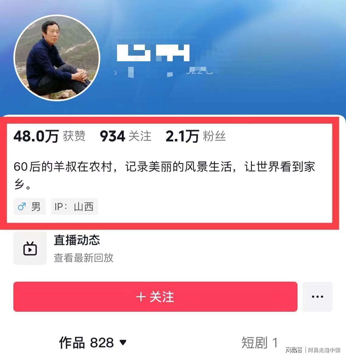 笔者翻出这位发布视频的游客,账号粉丝2.1万,已经发布了800多条视频,从视频里看,都是一些生活记录流水账,账号简介写着:60后的大叔在农村,记录美丽生活和风景,让世界看到家乡。