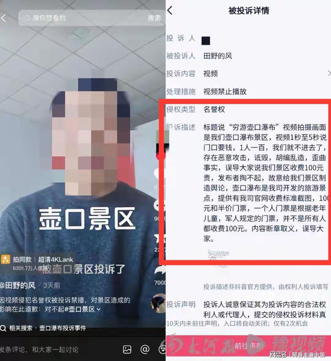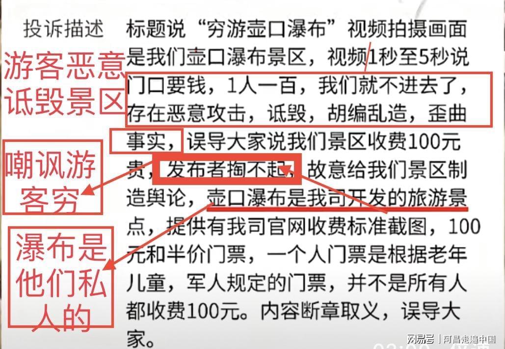 这段10秒钟的视频,一个旅行记录,尽被壶口瀑布景区投诉下架,景区投诉原话如下:标题说“穷游壶口瀑布”视频拍摄画面是我们壶口瀑布景区,视频1秒至5秒说门口要钱,1人一百,我们就不进去了,存在恶意攻击,诋毀,胡编乱造,歪曲事实,误导大家说我们景区收费100元贵,发布者掏不起,故意给我们景区制造舆论,壶口瀑布是我司开发的旅游景点,提供有我司官网收费标准截图,100元和半价门票,一个人门票是根据老年儿童,军人规定的门票,并不是所有人都收费100元。内容断章取义,误导大家。