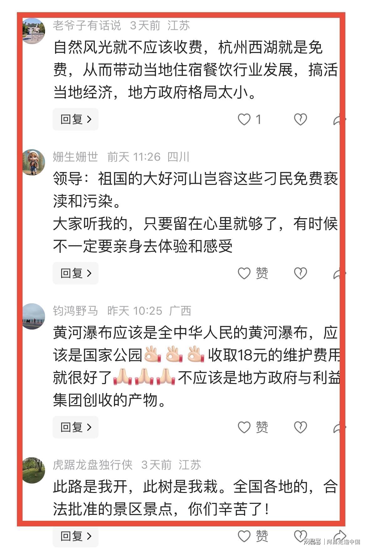 2、景区嘲讽游客买不起门票,带节奏,大自然的风光,亿万年形成的母亲河,属于每一个华夏儿女享受这片山水的权利,你们在景区修停车场收费,几步路能走到瀑布边上,要独自设立观光车收游客的的钱,门票100元,等于是一个游客进来看一眼,就要想方设法修各种旅游设施设施把游客荷包掏光,有人不愿意进来花钱,就嘲讽别人穷鬼,这种圈地收钱,一本万利,对游客傲慢蔑视,可见景区公关人员的素质堪忧,游客喊门票太贵,“妈”我不进去看你了,有网友反问一句:(这孙子不行,别人他开发了,让这孙子滚吧)。