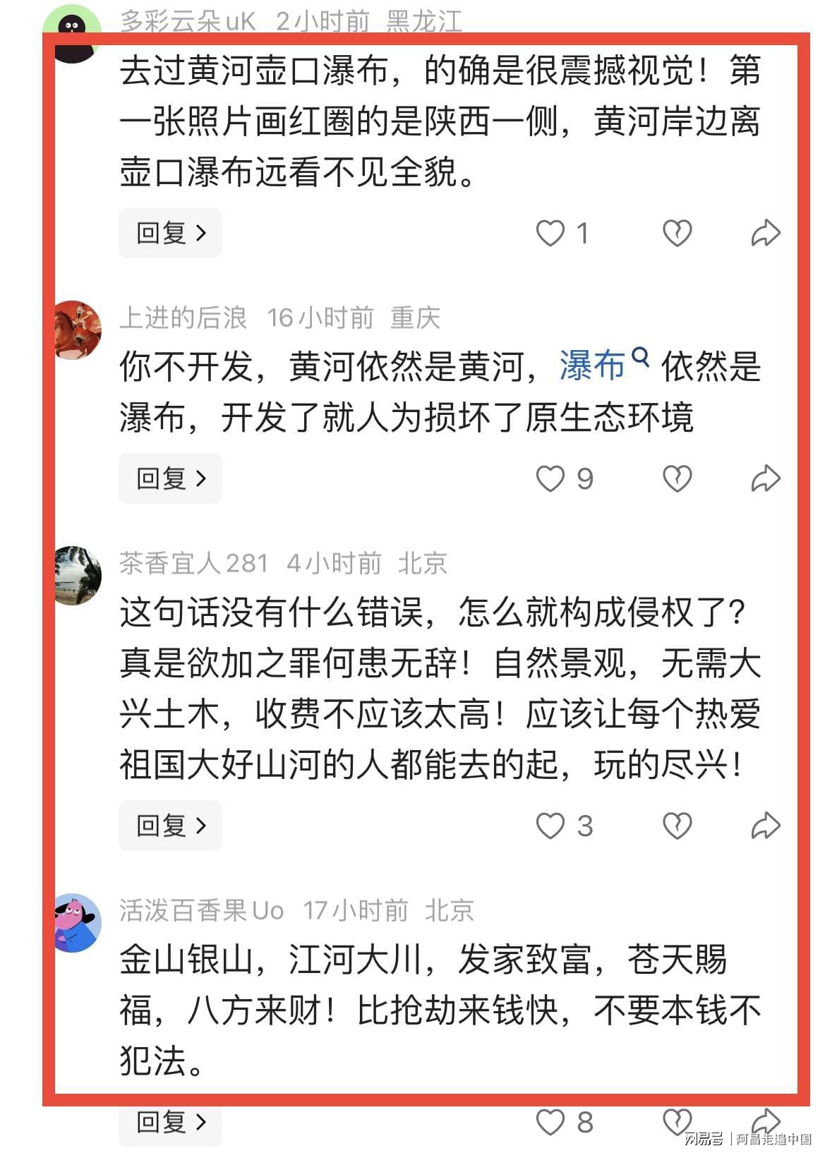 3、景区说,壶口瀑布是私人开发景点:网友说:壶口瀑布是他们公司开发的旅游项目,难道他们不开发,壶口瀑布就没了,他们用什么工具开挖的,什么时候开挖的,黄河是一条现代人工河?真是滑稽。