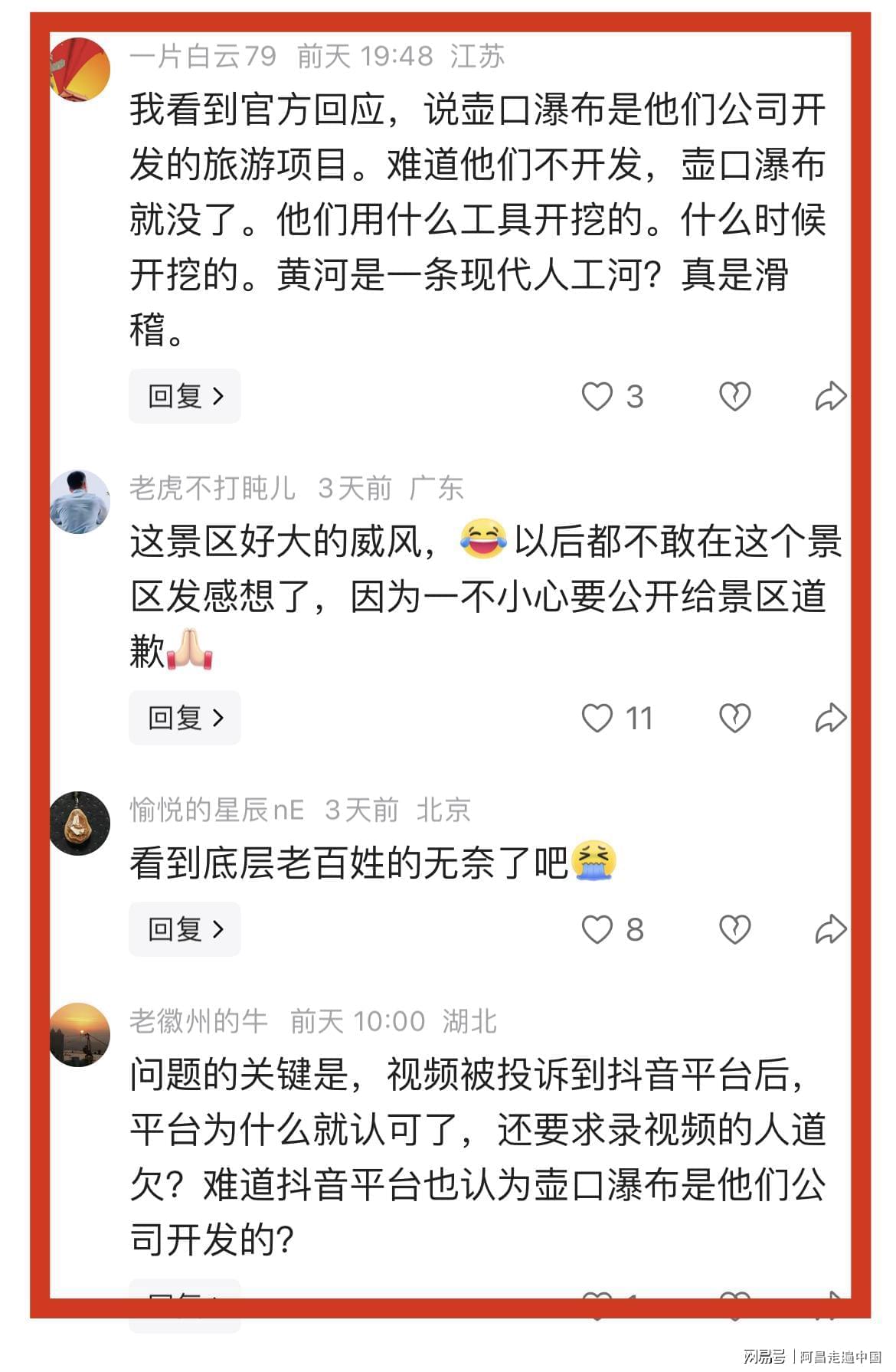 当游客道歉视频引起了网友共鸣:网友群涌进入陕西壶口瀑布景区和山西壶口瀑布景区文旅账号留言区留言嘲讽。
