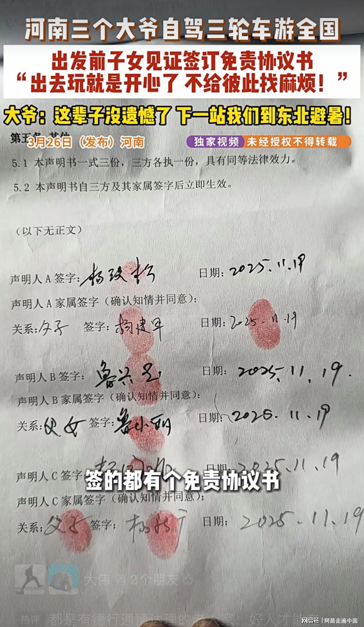根据《大象新闻》报道:三人患有身体基础疾病,这次自驾游出门之前,三人为了不给任何子女增加负担,三人签了免责协议,子女们都按上了手印,任何人旅途出事,都不会要其他兄弟负担任何责任,也免去了儿女们担心。