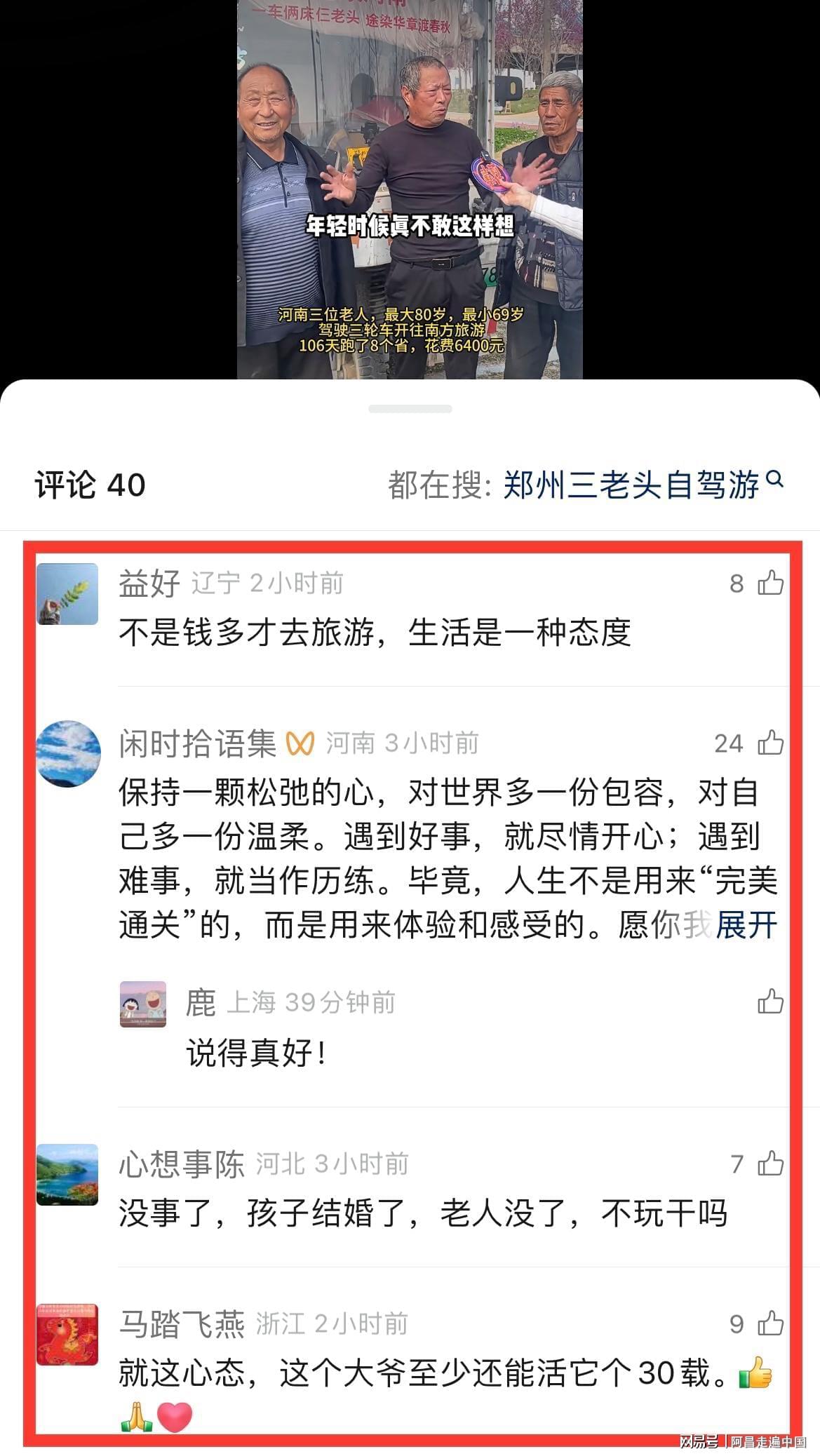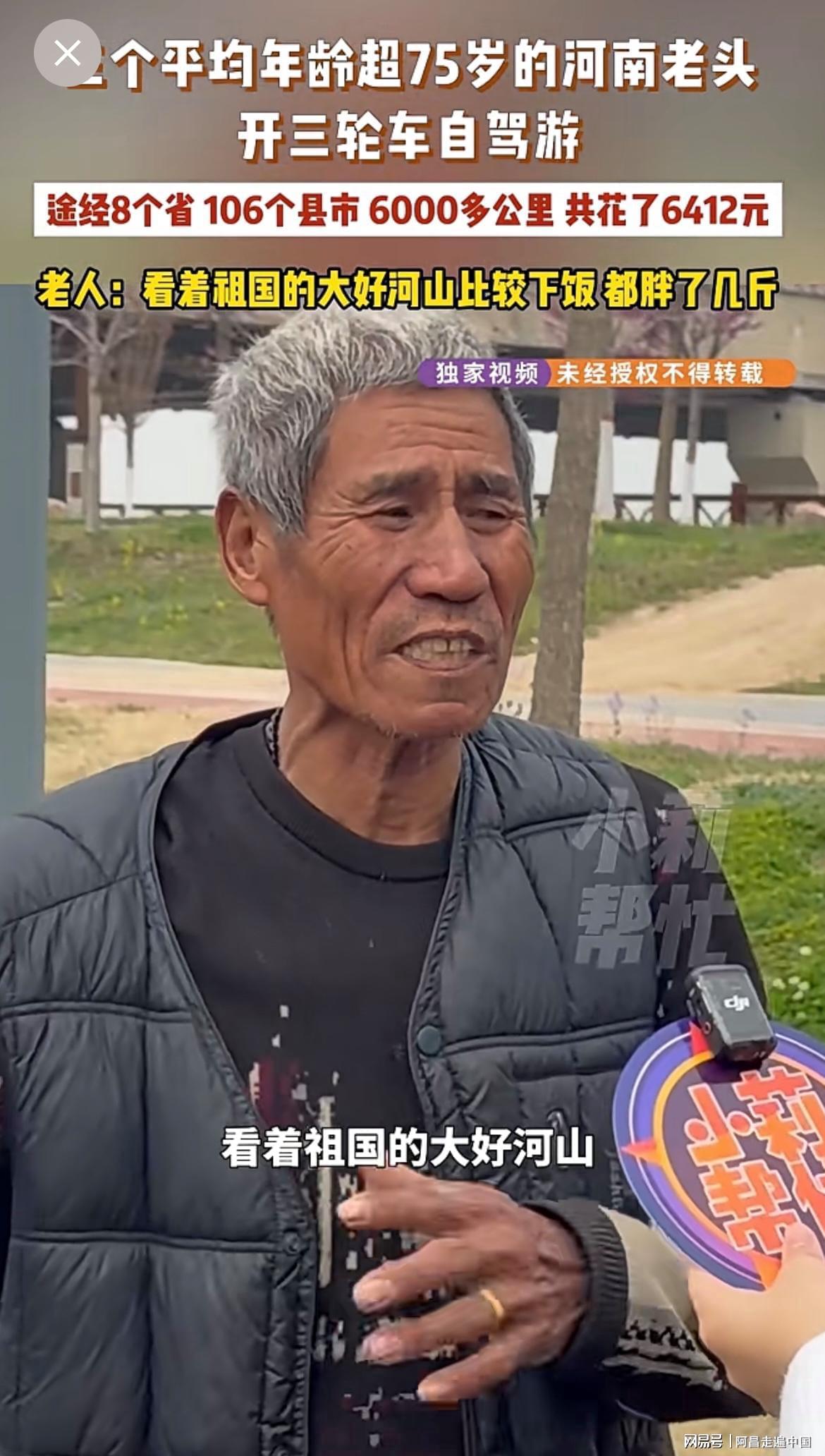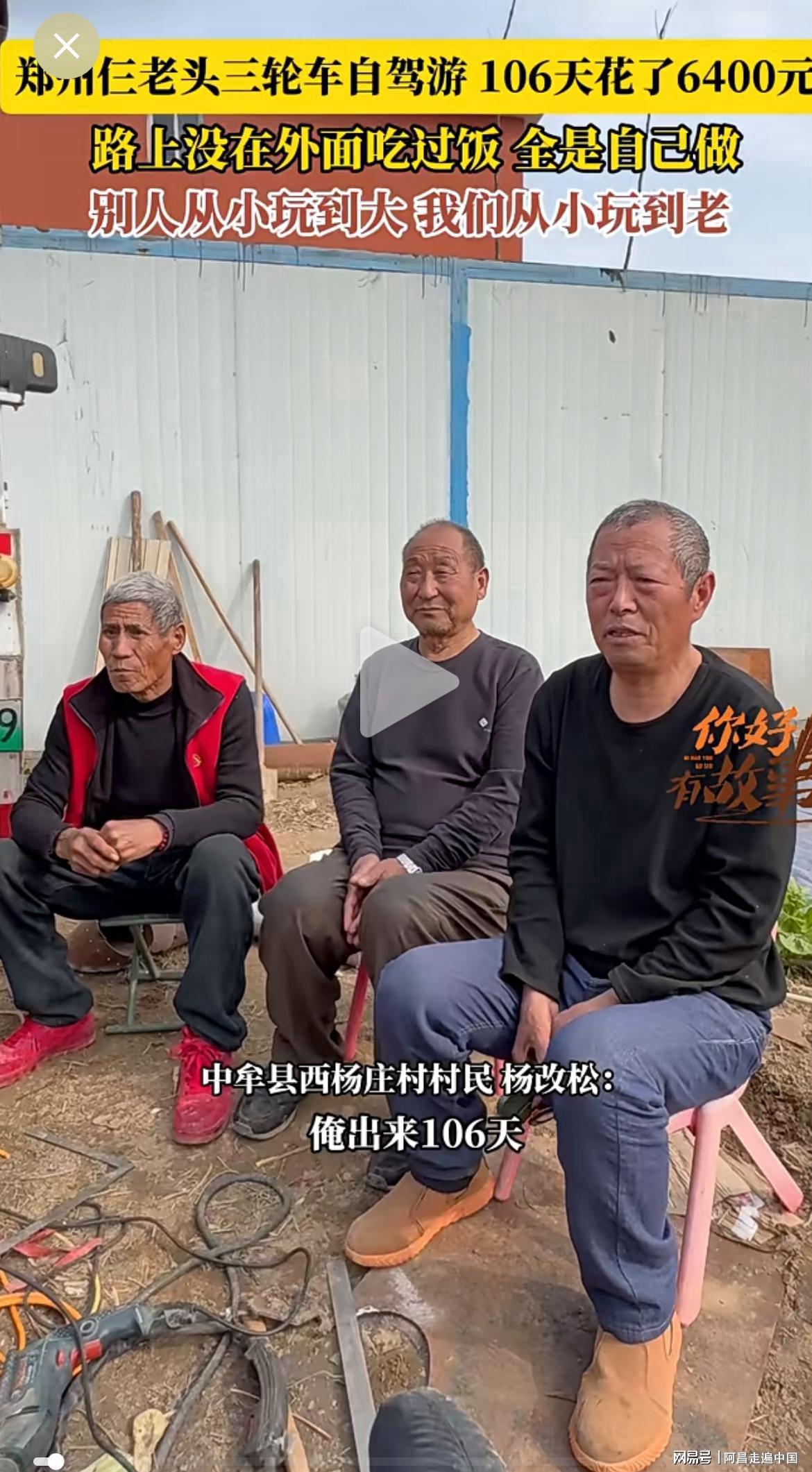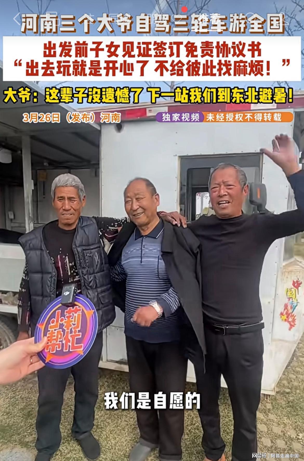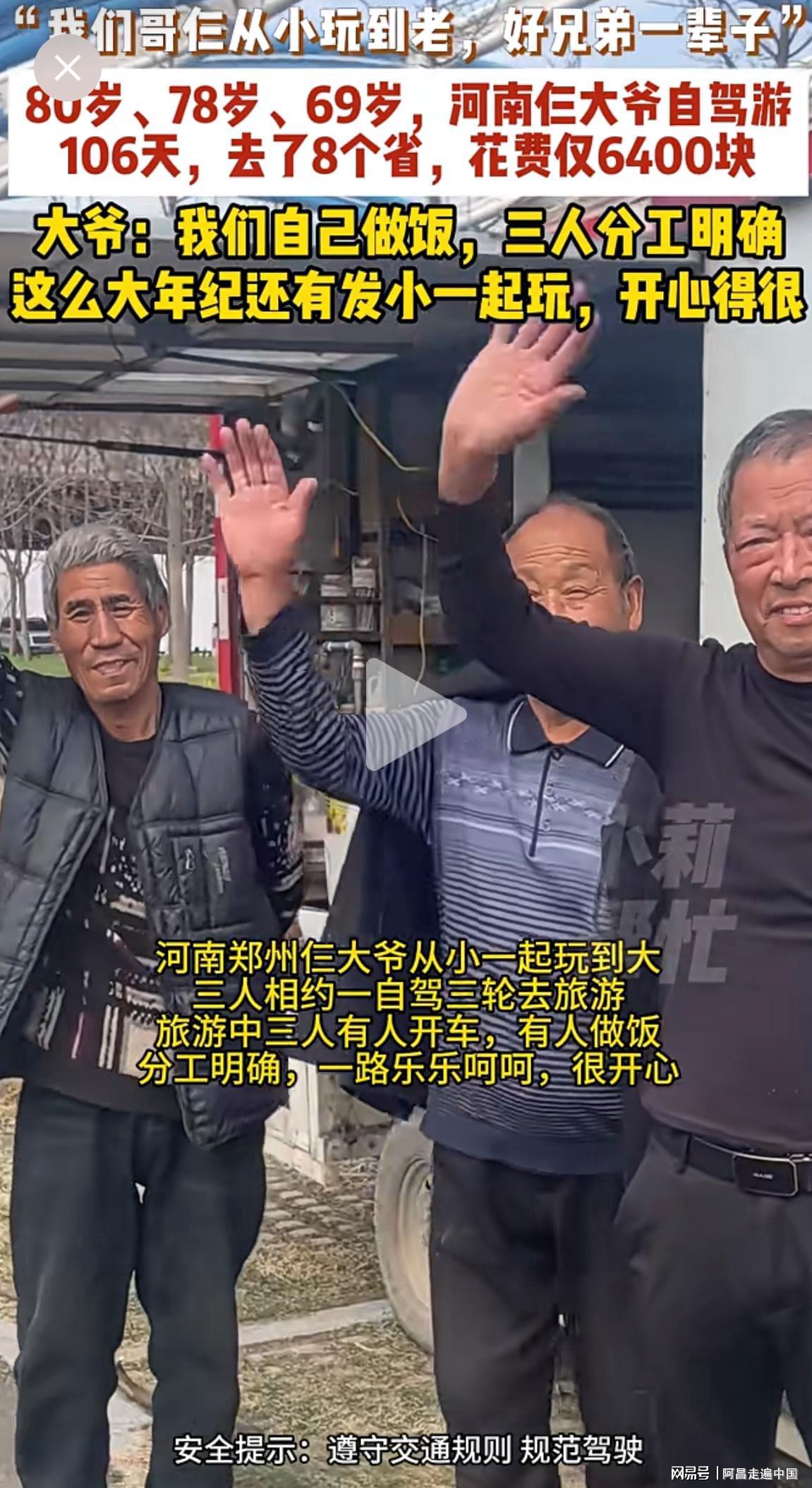三个老头视频在网络走红,接受采访时表示,河南很大,一望无际平原,这个年龄不出来看看祖国大好河山,以后去世了也很遗憾,如今行程106座城市,死而无憾,这个年龄在家也能吃好喝好,但是出来游历大好河山,心情不一样。