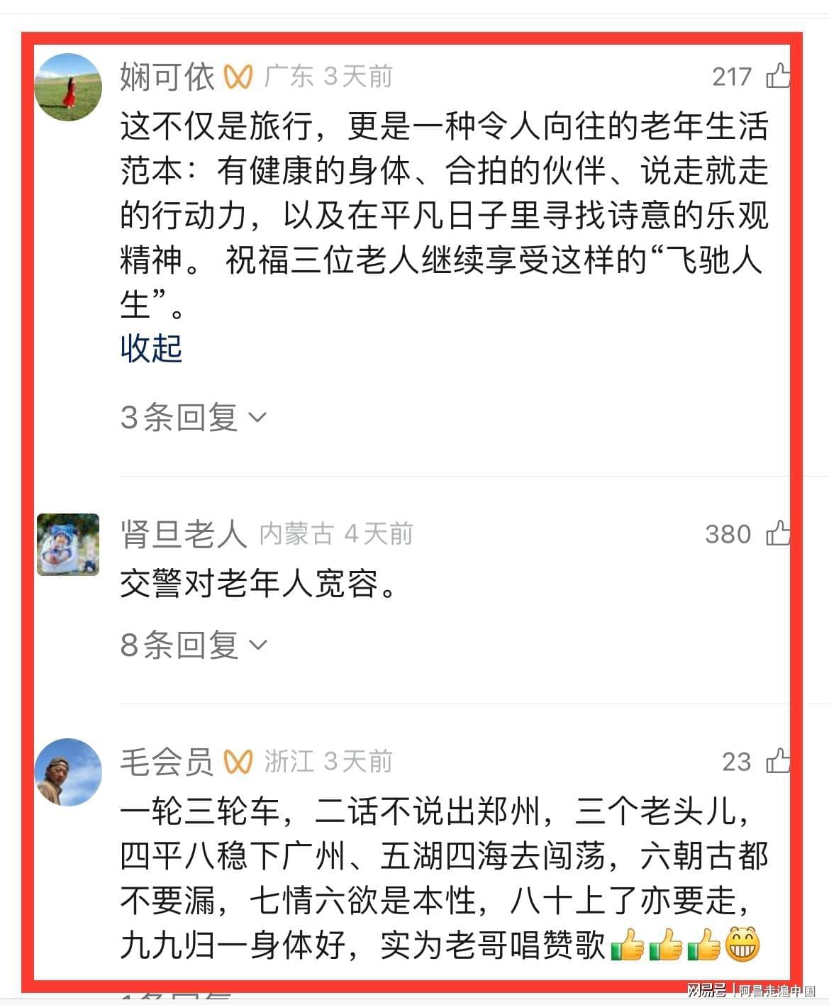 3、这不仅是旅行,更是一种令人向往的老年生活范本:有健康的身体、合拍的伙伴、说走就走的行动力,以及在平凡日子里寻找诗意的乐观精神。 祝福三位老人继续享受这样的“飞驰人生”。
