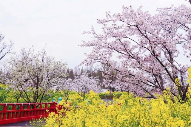 公园内,百樱林的早樱、金黄油菜花也逐渐进入最佳观赏期,各色花朵如云似霞,让人沉醉不已。在千米紫藤长廊,大片长穗花藤交错垂落,白色、粉色、紫色的长穗紫藤竞相绽放,形成一条浪漫的花雨长廊。