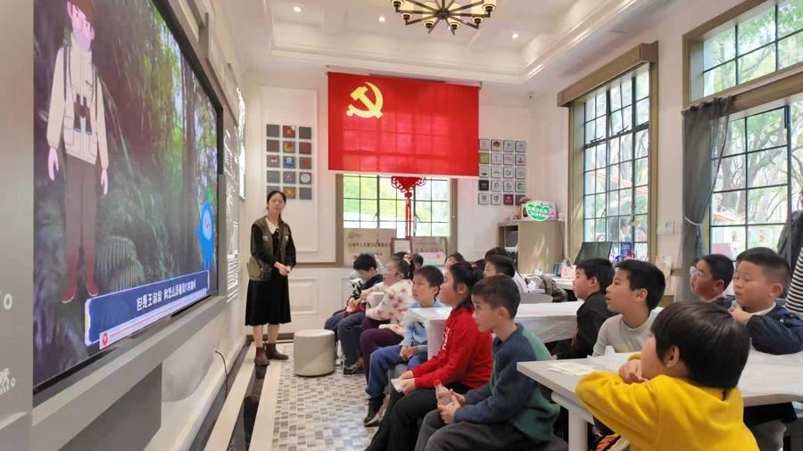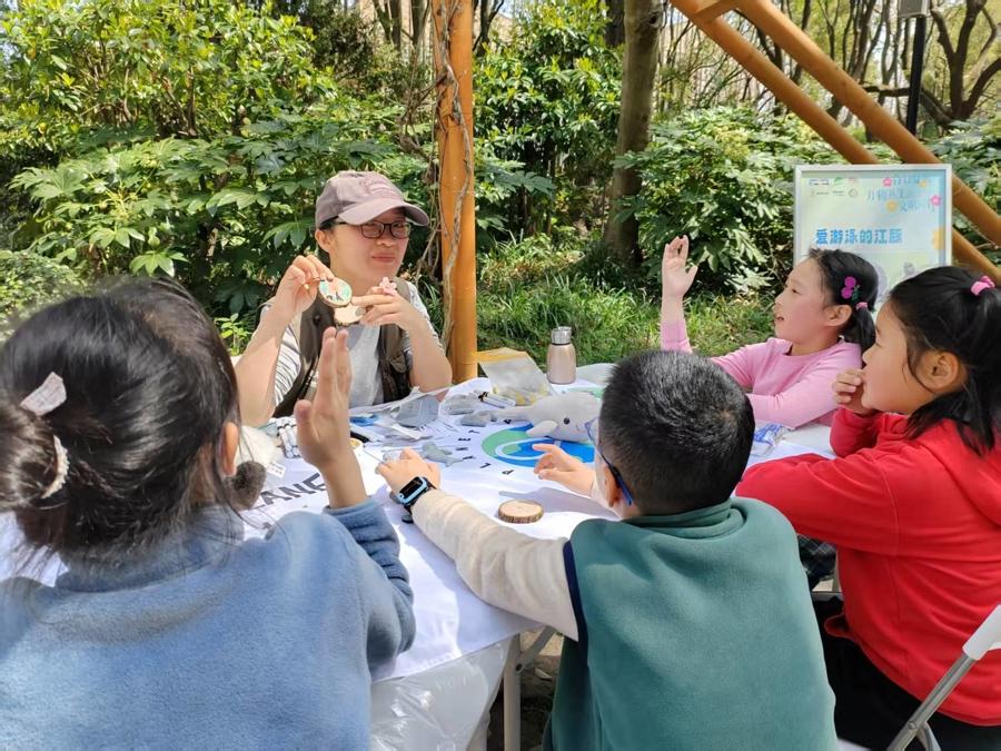 走进公园的游客,不时会遇到飞奔而来的小学生,这群“文明小使者”手持“文明定海”倡议书,邀请叔叔阿姨、爷爷奶奶们在主题背景板上签名,共同响应创建全国文明城区的号召。还有一些孩子加入到杨浦滨江实验小学学生的队伍中,在复兴岛公园党群服务站的跨学科自然科普系列课堂以及科普市集中,聆听一个地球自然基金会“益节课”项目的老师们带来《了不起的熊猫》主题课,以及制作“守护熊猫”冰箱贴、雪豹等珍稀动物造型折纸、树叶画等,在游戏和趣味知识问答中了解文明创建、垃圾分类、野生动物保护等知识。在杨浦滨江实验小学开设的“校家社”咨询台上,老师们也为家长们解答了关于家庭教育、青少年成长等方面的疑问。