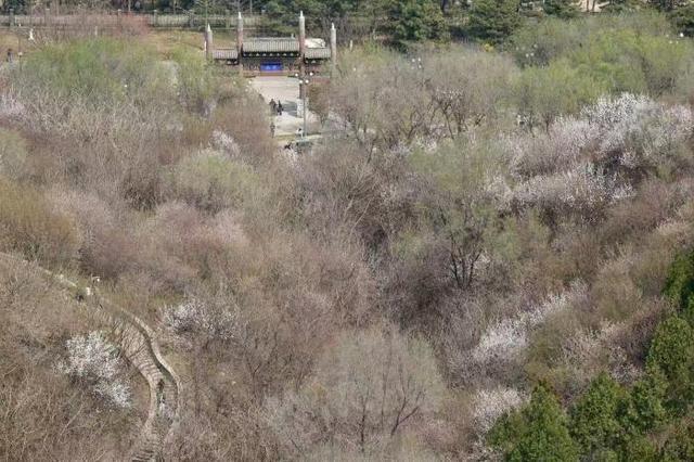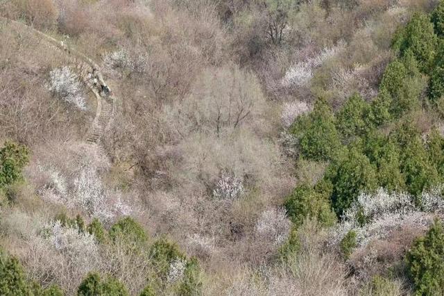 桃花谷的山桃花沿坡地铺展,层层叠叠的花瓣与山间步道、古建相互映衬。