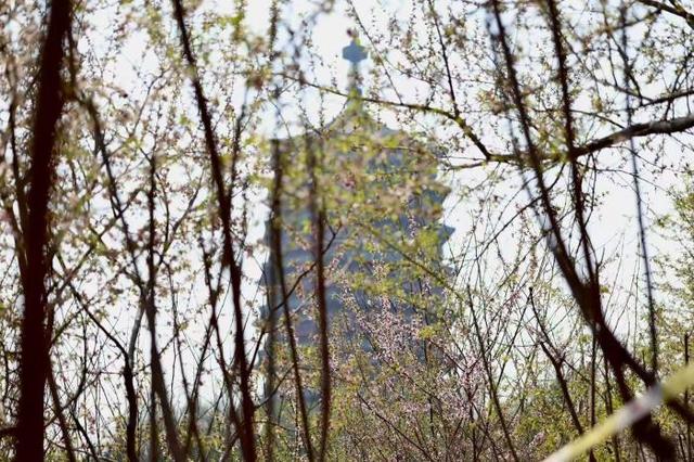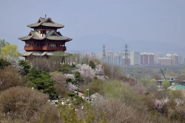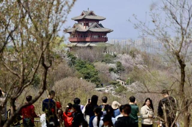 山桃花与连翘目前均处于盛花阶段,市民可从园博园6号门入园,便捷抵达桃花谷、永定塔区域观赏,登阁还可俯瞰花海与城市天际线,尽享都市里的春日野趣。