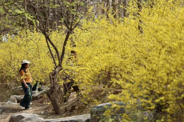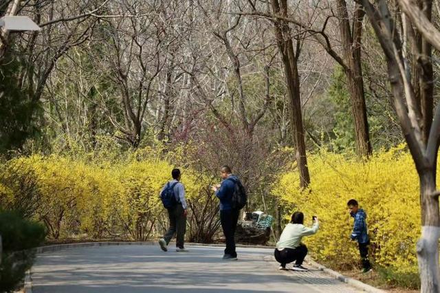 永定塔周边的连翘林也同步盛放,明黄满枝,两种春色在园区内交织成景。