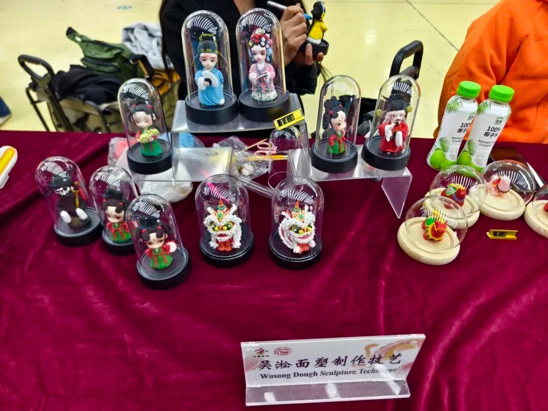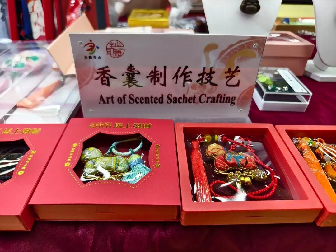 在这里,宝山非遗项目中的香囊、吴淞面塑,奉贤非遗项目中的滚灯、土布、卓文后雪花膏等等,都深深地吸引了游客们,一些外宾甚至爱不释手,选购相关非遗纪念品;孩子们则被玲珑精致的滚灯吸引,抱着时明时暗的滚灯进行体验。这时候,几名身穿传统红色表演服的年轻人在大厅即兴表演了“莲湘舞”,把江南民间庆丰收的喜悦场景呈现给在场的中外游客。