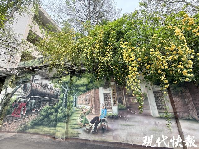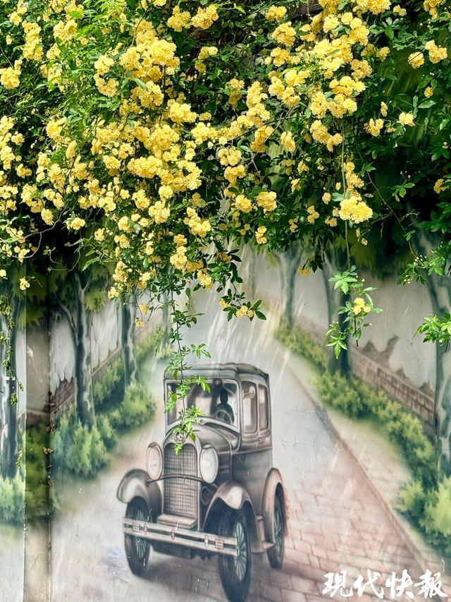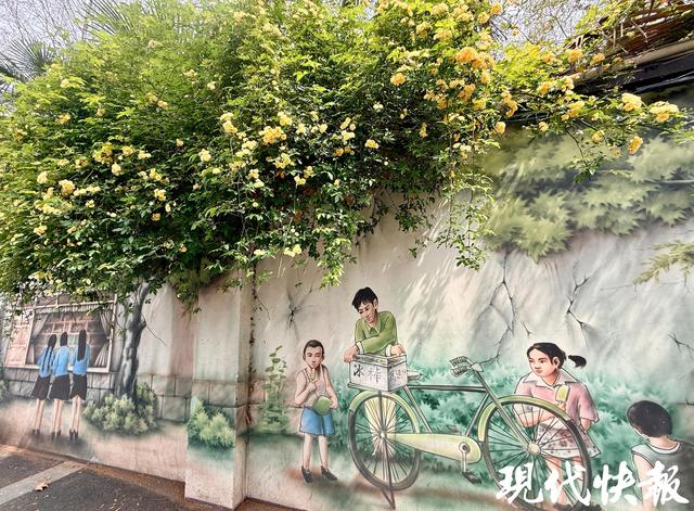 一旁“碑亭印记”墙绘静静伫立,光华照相馆、卖货郎、报童等老南京的市井场景鲜活再现,木香花仿佛从画中生长而出。虚实交织间,复古与文艺碰撞出独特韵味。