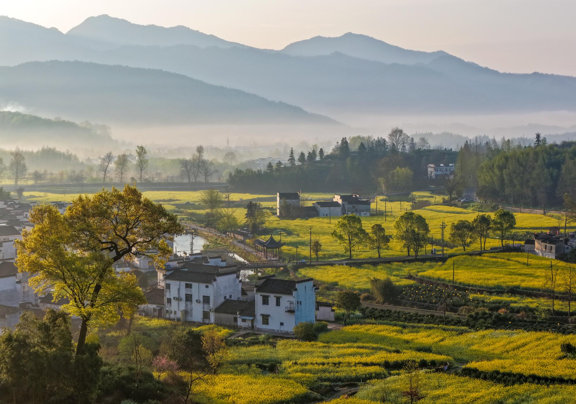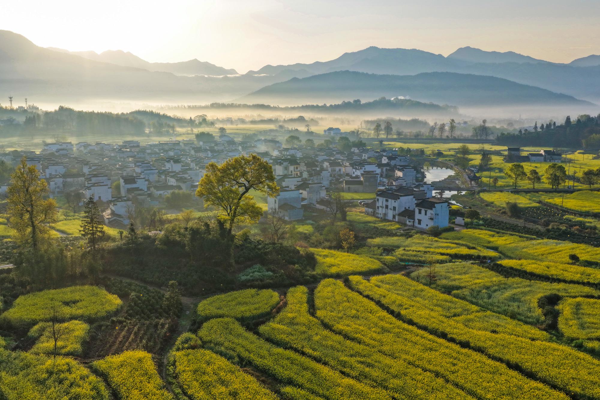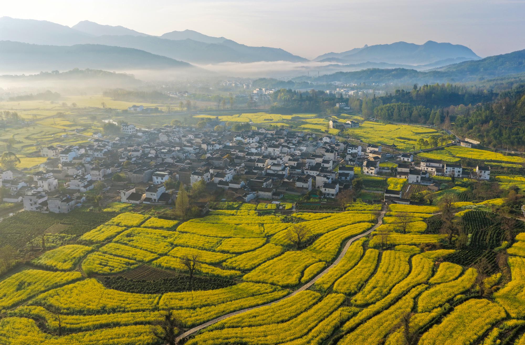 2026年4月2日,春雨初霁的安徽省黄山市黟县卢村晨雾弥漫,金黄的油菜花田与粉墙黛瓦的徽派民居在云雾中若隐若现,宛若一幅流动的水墨画卷。