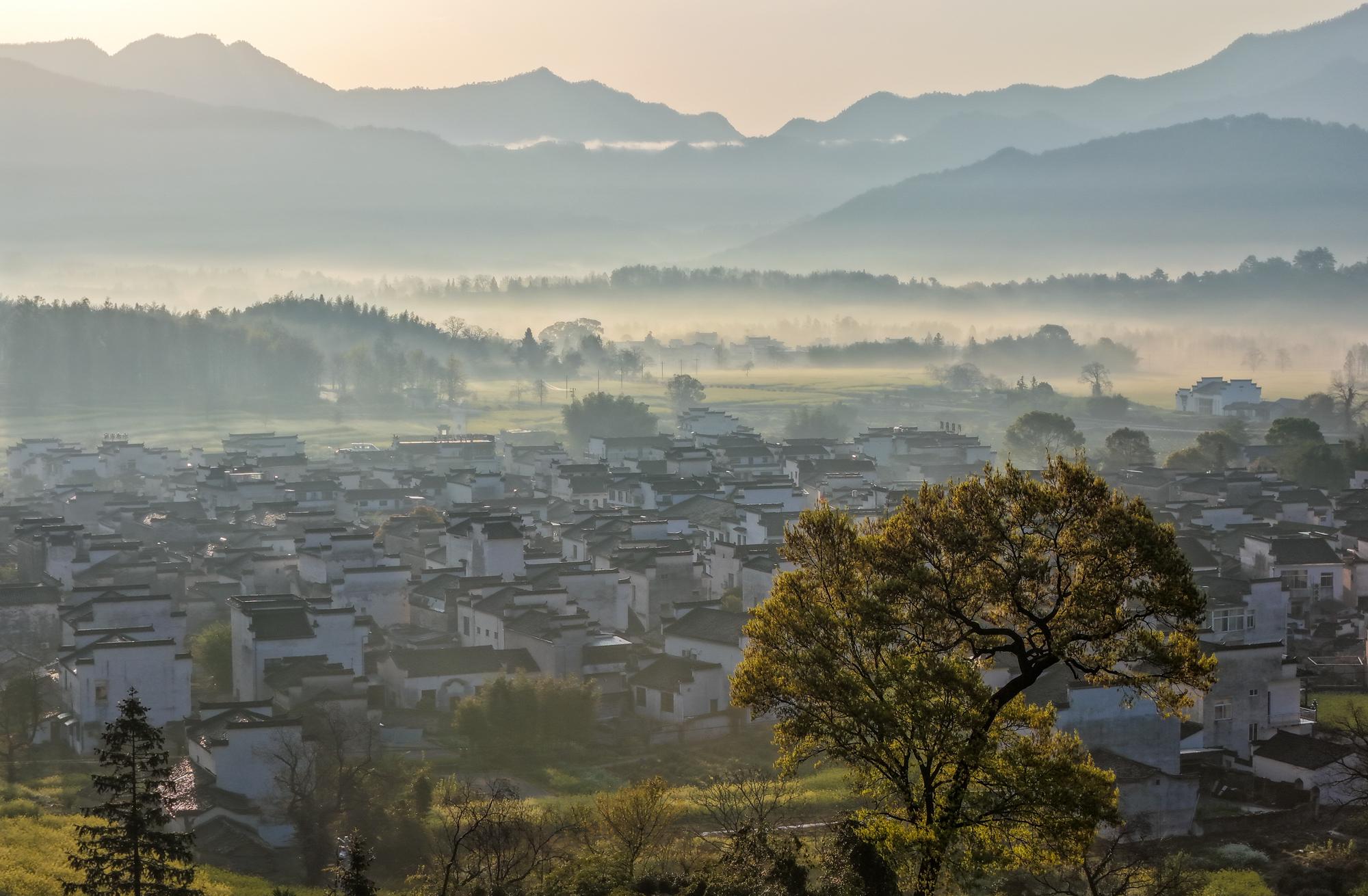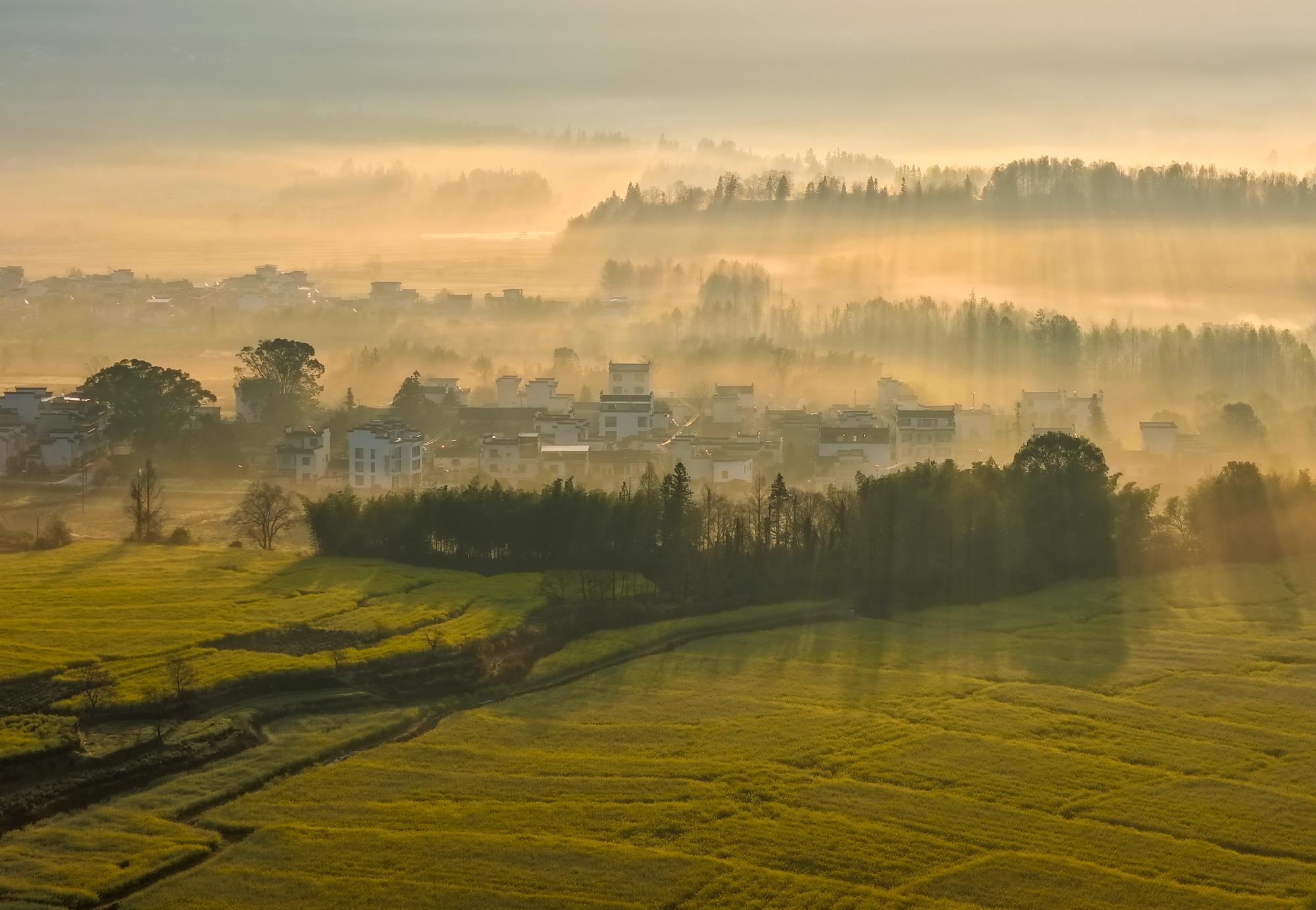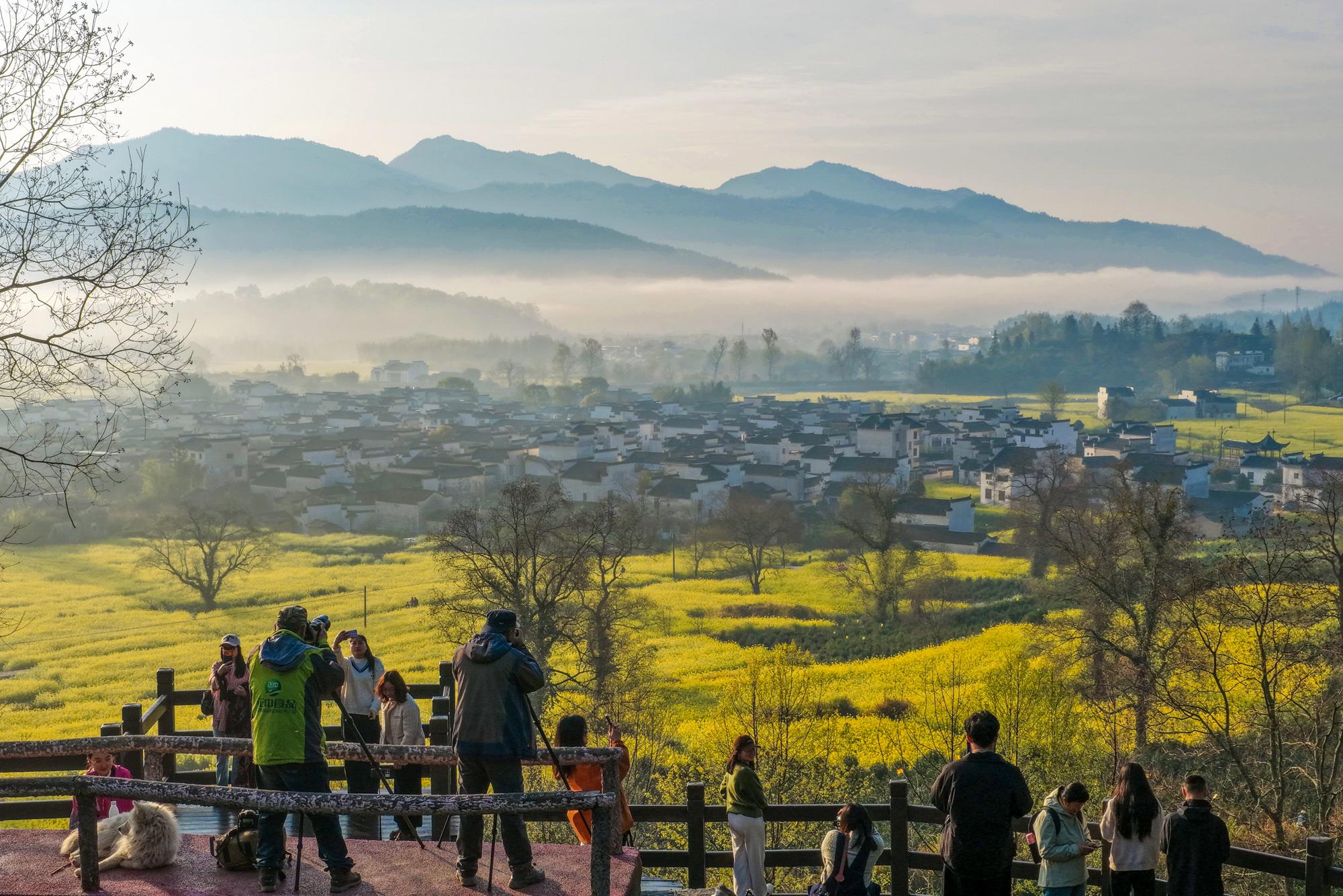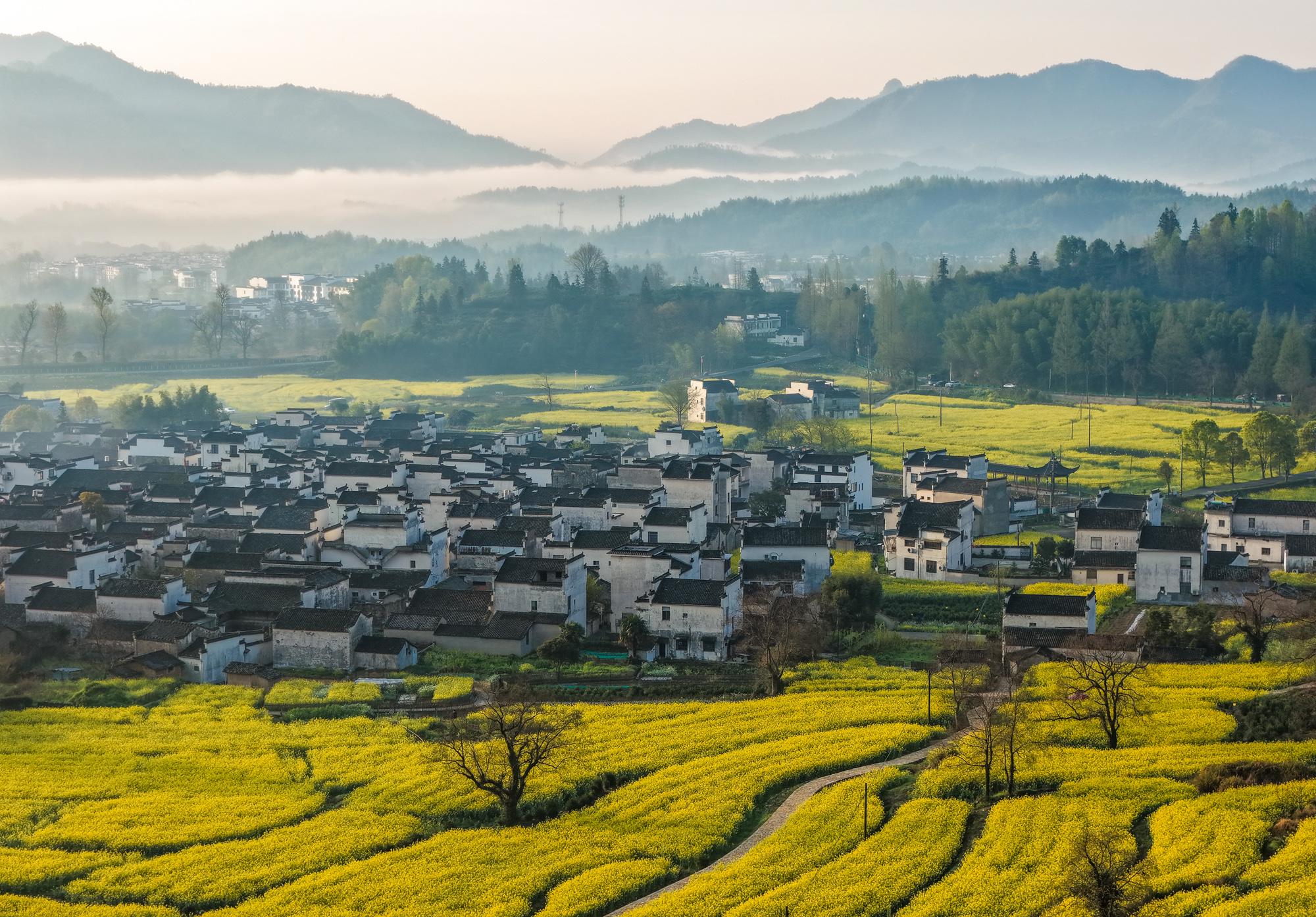 2026年4月2日,春雨初霁的安徽省黄山市黟县卢村晨雾弥漫,金黄的油菜花田与粉墙黛瓦的徽派民居在云雾中若隐若现,宛若一幅流动的水墨画卷。