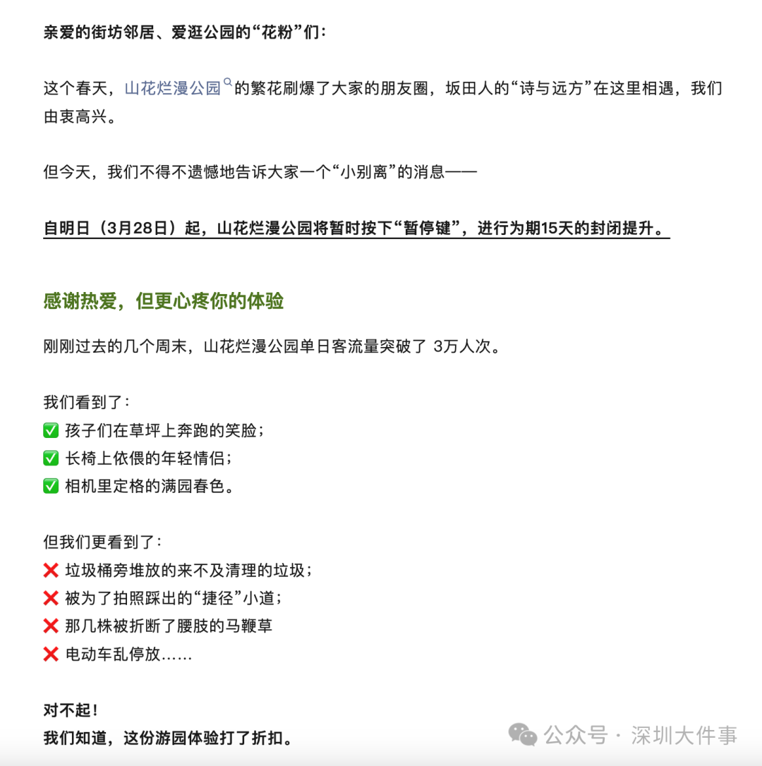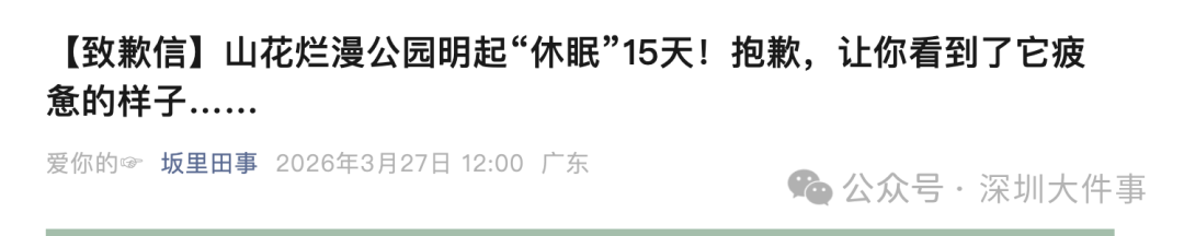 记者注意到,山花烂漫公园所在的坂田街道办,也于近日发布“致歉信”,称山花烂漫公园将“休眠”15天。