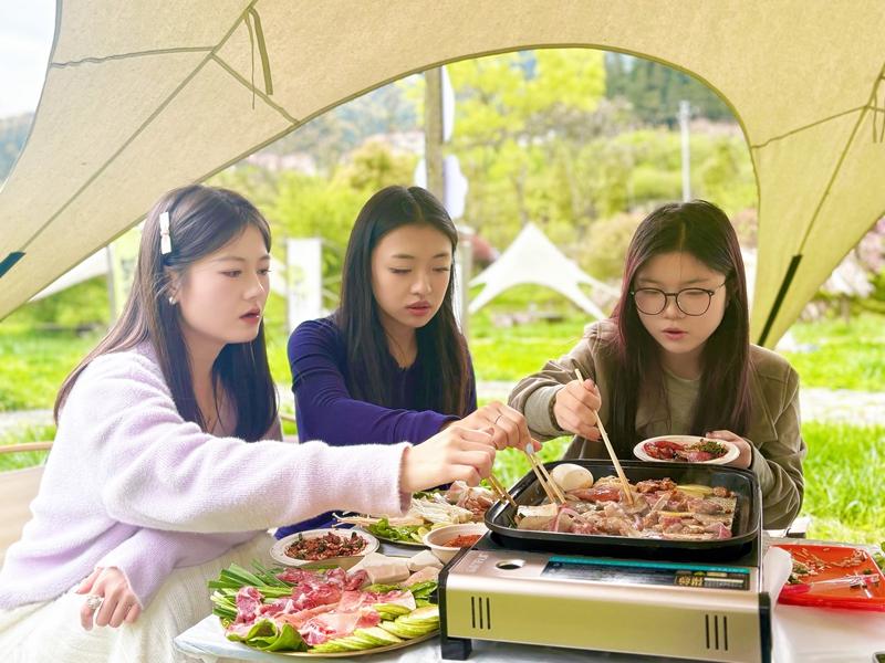 游客们围坐闲谈、烧烤娱乐,沉浸式感受田园慢生活的惬意。