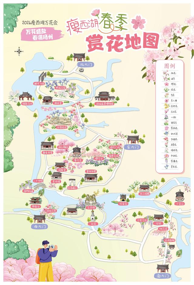 据扬州市瘦西湖风景区管理处党委书记、主任徐树强介绍,今年万花会依托瘦西湖“五大花季”——桃花季、海棠季、樱花季、琼花季和芍药季,将花卉观赏与多元文化体验深度融合,为方便广大游客在瘦西湖沉浸式赏花,景区推出瘦西湖春季赏花手绘地图。景区在主要游览线路上设置了多处国风打卡点、非遗互动区和光影艺术装置,游客不仅可以赏花拍照,还能参与花间茶会、汉服巡游、非遗手作等沉浸式活动,感受“人在花中走,似在画中游”的诗意体验。